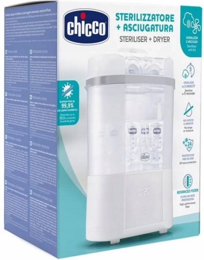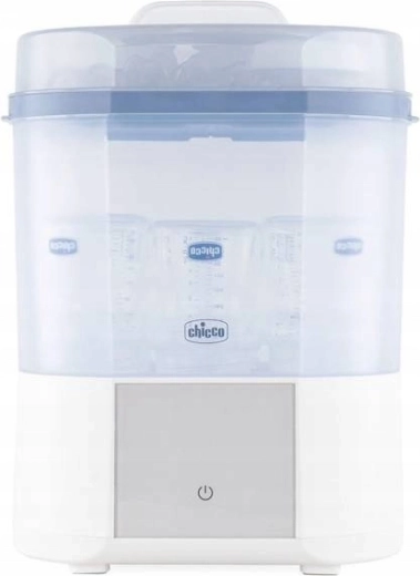 Chcesz mieć dziecięce butelki, smoczki i akcesoria niemowlęce higienicznie czyste bez wysiłku? Elektryczny sterylizator parowy Chicco z funkcją suszenia zapewnia skuteczną dezynfekcję dzięki parze oraz następującemu po niej aktywnemu suszeniu, które zapobiega kondensacji i resztkowej wilgoci. Obsługa jest intuicyjna poprzez panel dotykowy, więc łatwo wybierzesz sterylizację, łączony cykl sterylizacja + suszenie lub samo suszenie.
