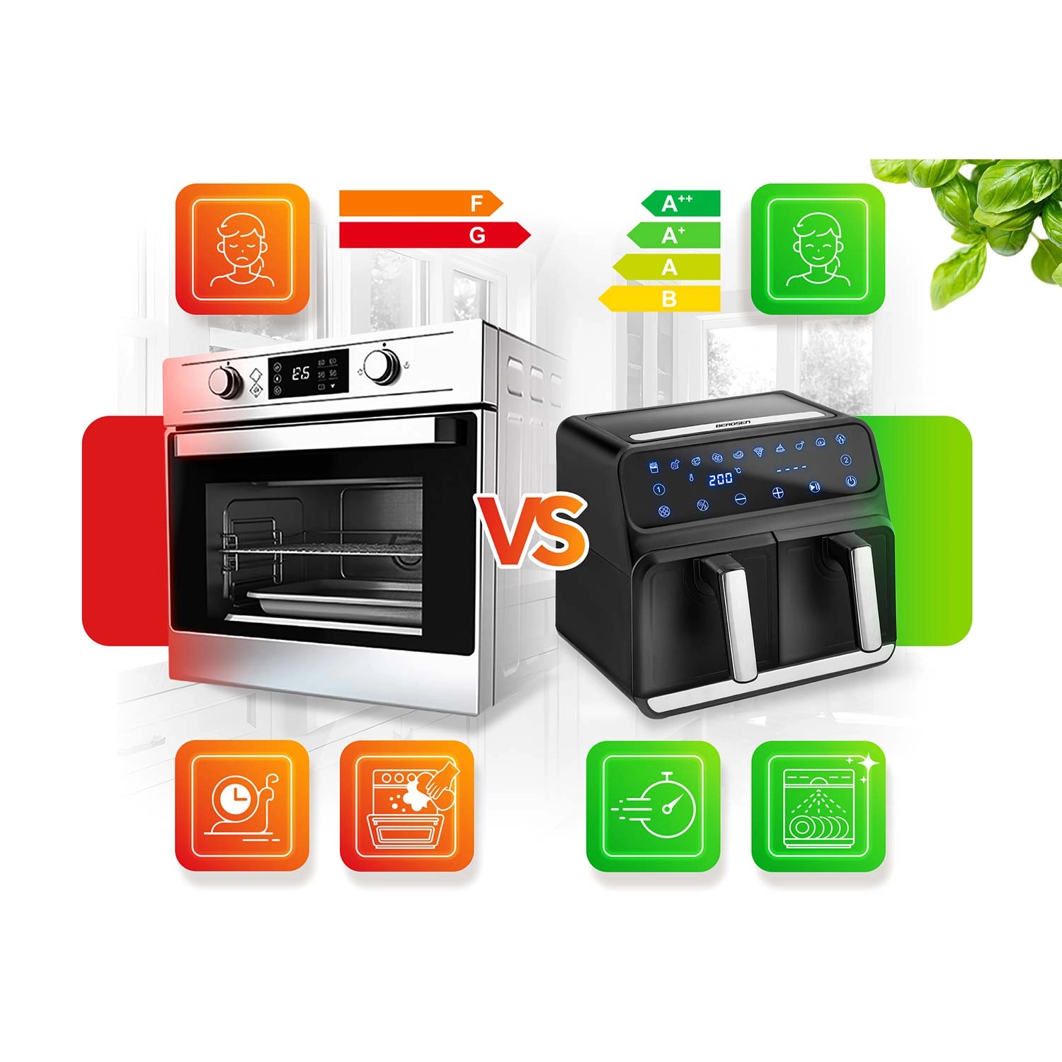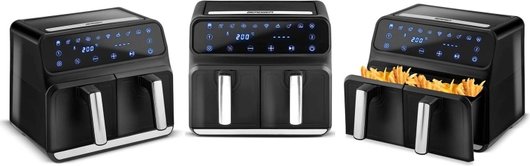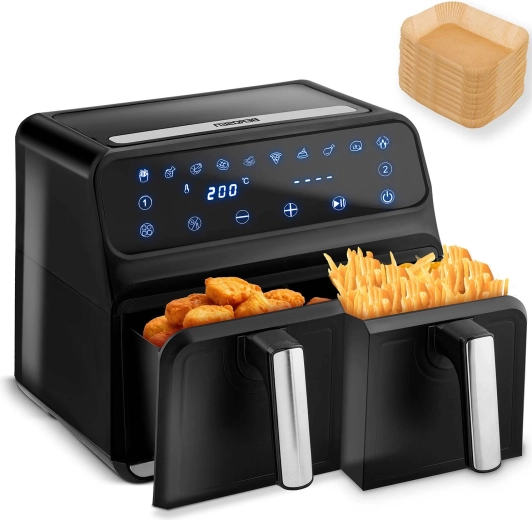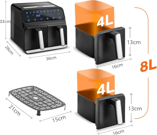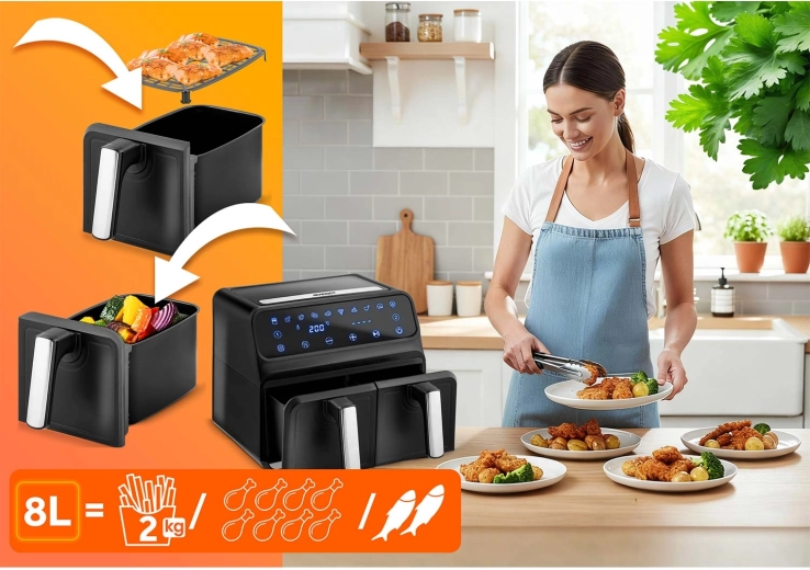 Gotuj zdrowiej bez kompromisów w smaku. Gorące powietrze krąży równomiernie, tworząc chrupiącą skórkę i soczysty środek – bez zapachu oleju i zbędnego bałaganu. Dwa niezależne kosze pozwalają jednocześnie przygotować danie główne i dodatek, oszczędzając czas i energię.