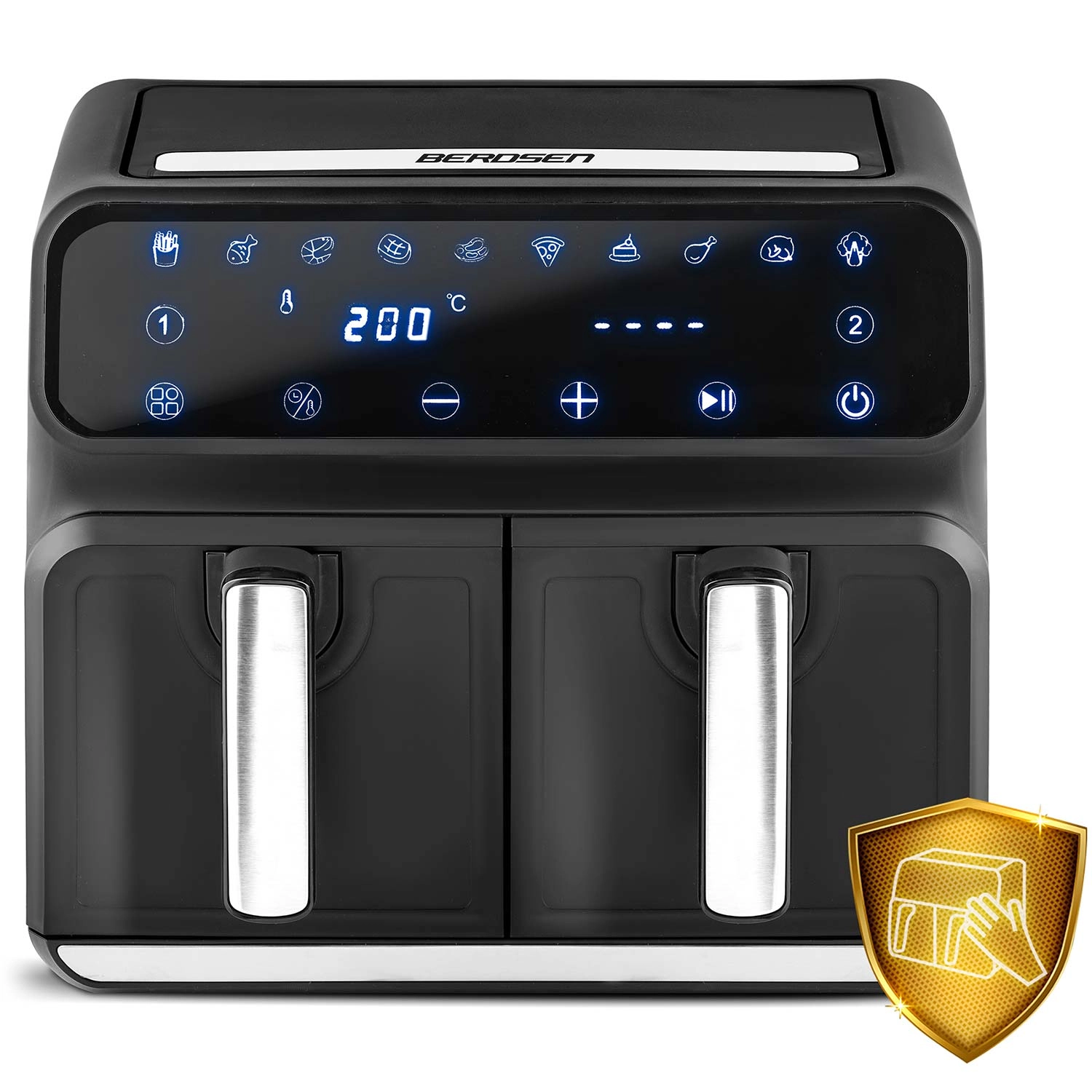 Intuicyjna obsługa zapewniona jest przez panel dotykowy z czytelnymi ikonami oraz 10 inteligentnymi programami do frytek, ryb, krewetek, steków, kurczaka, wieprzowiny, pałek, pizzy, ciasta i warzyw. Temperaturę łatwo ustawisz do 200 °C, a czas do 60 minut. Kosze i blacha z nieprzywierającą powłoką PTFE mogą być myte w zmywarce – pielęgnacja zajmuje chwilę.