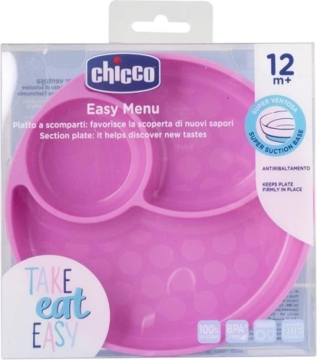 Silikonowy talerz CHICCO z linii Take Eat Easy został zaprojektowany do wygodnej i bezpiecznej nauki samodzielnego jedzenia. Trzy oddzielne przegródki utrzymują potrawy osobno, co ułatwia dzieciom odkrywanie nowych smaków i tekstur. Niezawodna przyssawka na spodzie mocno trzyma talerz na stole i pomaga zapobiegać przewróceniu.