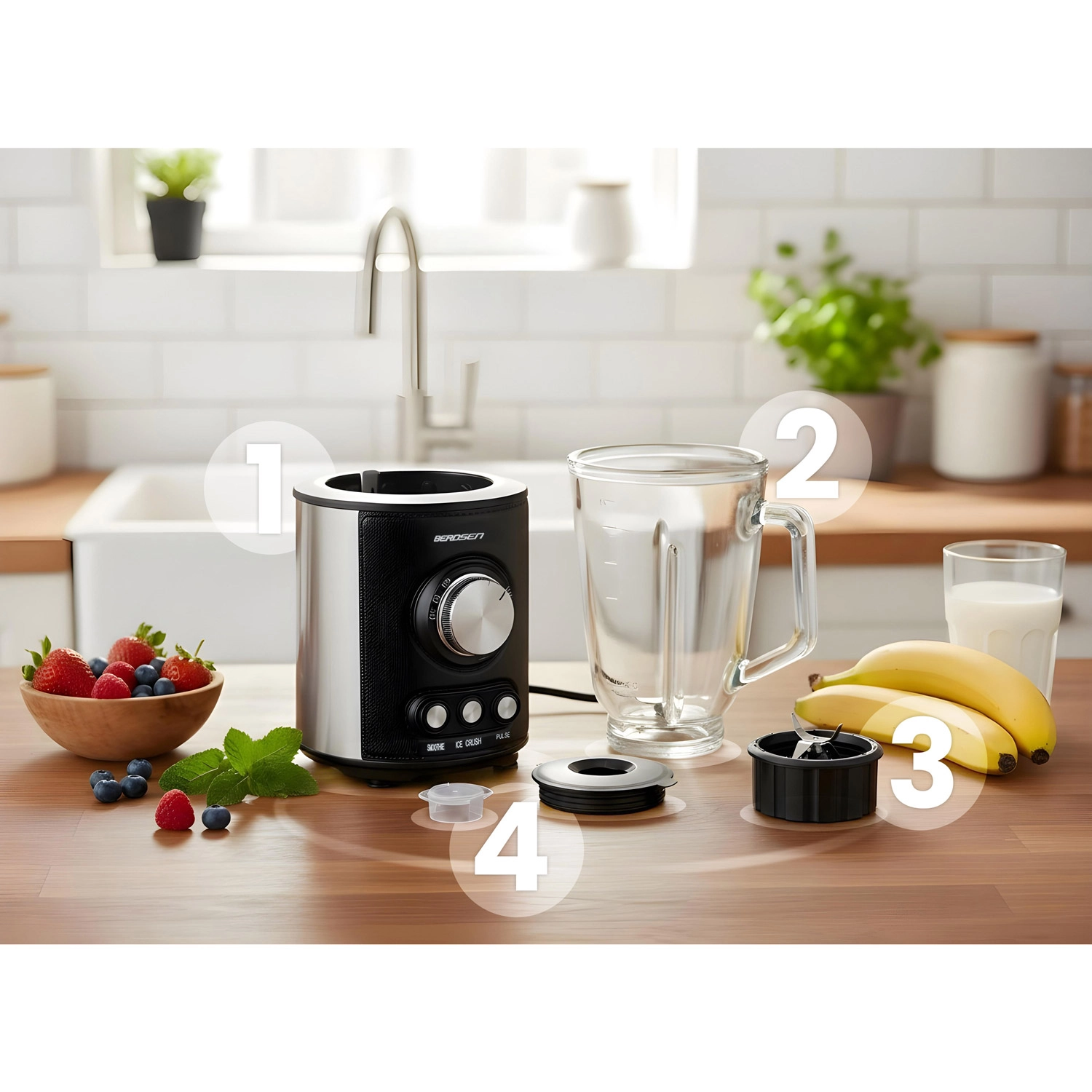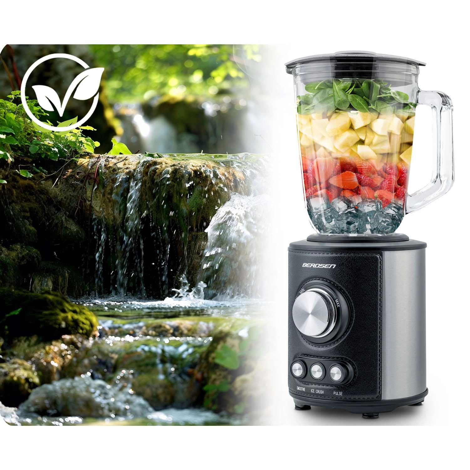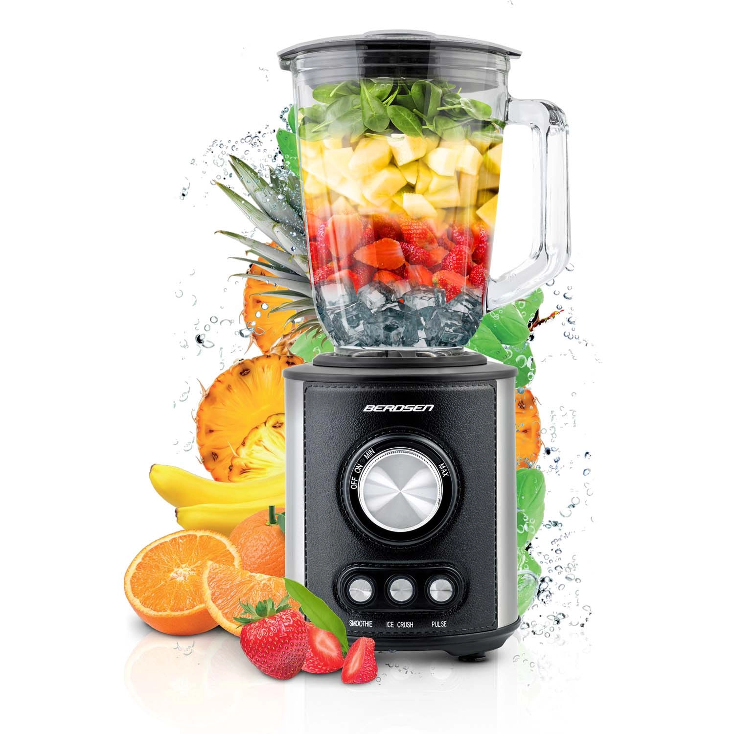 Wydajny blender kielichowy BERDSEN o pojemności 1,5 l i mocy 800 W poradzi sobie ze smoothie, zupami i kruszeniem lodu. Posiada szklany dzban, noże ze stali nierdzewnej oraz 3 automatyczne programy – Smoothie, Ice Crush i Pulse. Docenisz podświetlane sterowanie, antypoślizgowe nóżki, łatwe czyszczenie oraz zabezpieczenia przed przegrzaniem i nieprawidłowym montażem.