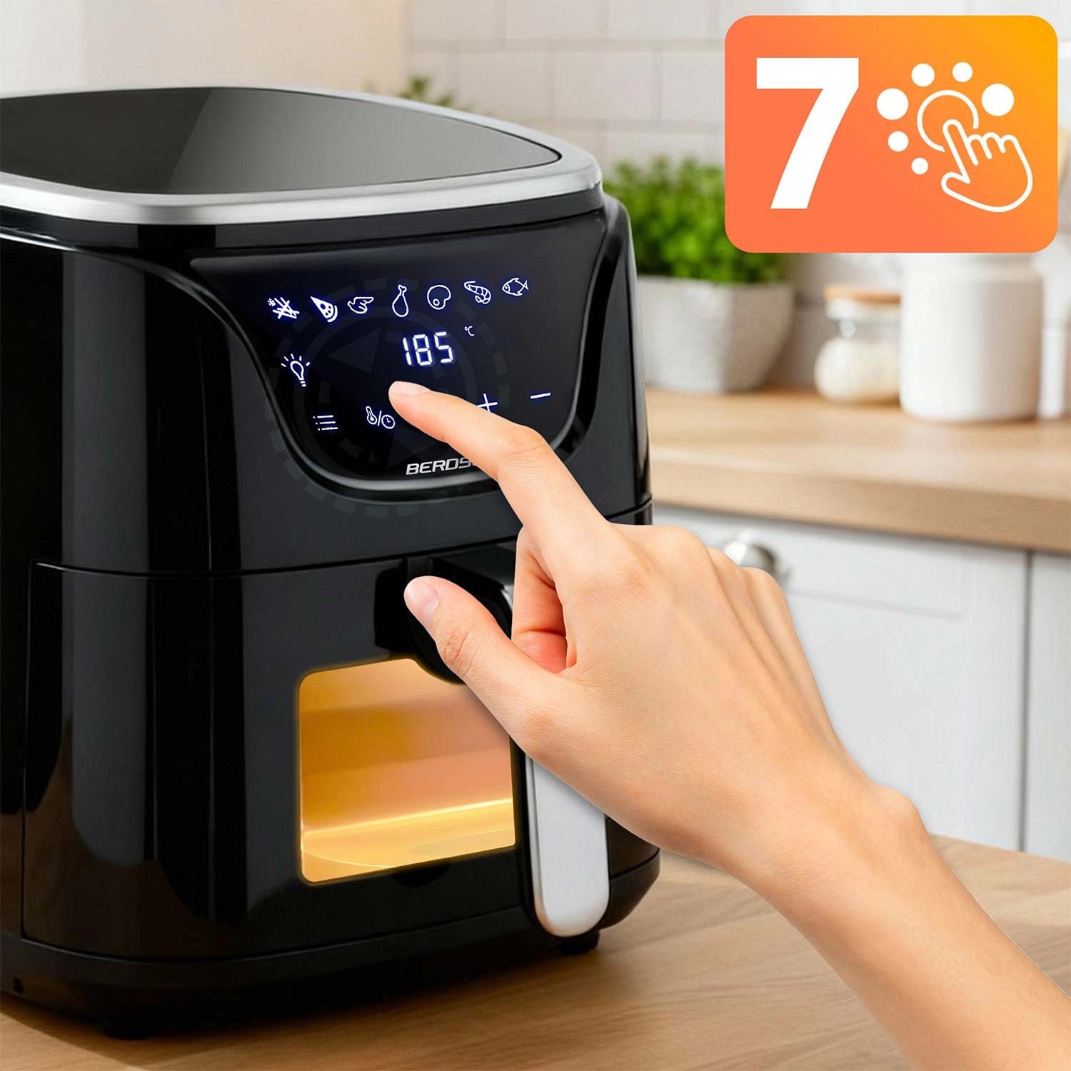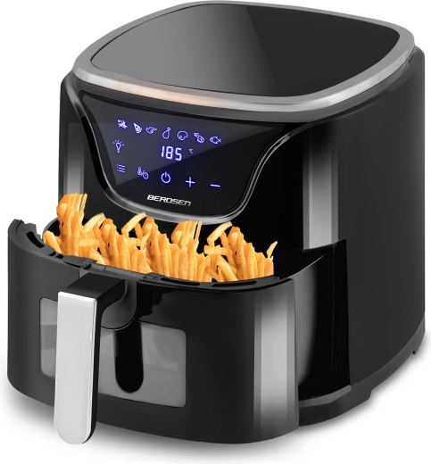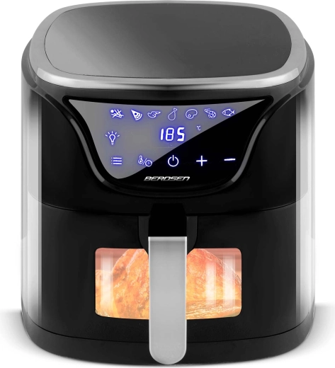 Odkryj zdrowsze gotowanie z frytkownicą beztłuszczową BERDSEN 5 l – kompaktowym pomocnikiem dla całej rodziny. Dzięki cyrkulacji gorącego powietrza przygotujesz chrupiące i soczyste potrawy przy nawet o 90% mniejszej ilości tłuszczu. Oferuje 7 automatycznych programów, dotykowy panel LED z okienkiem do kontroli pieczenia, regulację temperatury do 200 °C oraz moc 1500 W dla szybkich rezultatów. Kosz i taca nadają się do mycia w zmywarce, a w zestawie znajdziesz także papierowe wkładki gratis.