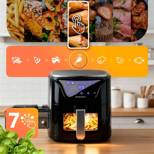 Doświadcz uniwersalności w kuchni: poza smażeniem gorącym powietrzem urządzenie piecze, grilluje, podgrzewa i suszy owoce oraz warzywa. 7 inteligentnych programów automatycznie dobiera idealny czas i temperaturę dla frytek, pizzy, skrzydełek, pałek, steku, krewetek i ryb. Do dyspozycji masz regulację temperatury do 200 °C, timer 0–60 min, praktyczne podświetlenie LED oraz przypomnienie o obróceniu potrawy.
