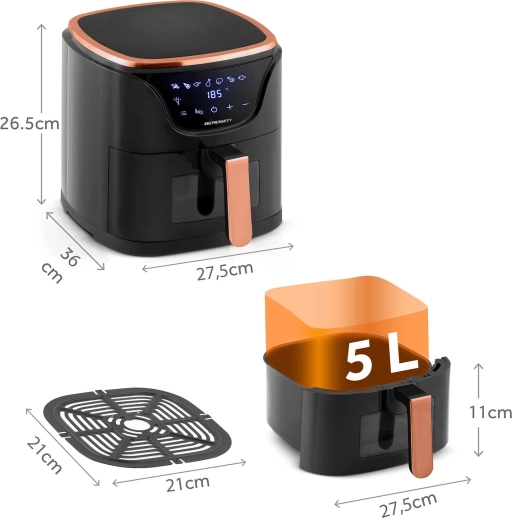 BERDSEN BD‑652 łączy moc 1500 W, elegancki czarny design z miedzianymi/rose‑gold detalami oraz sprytne funkcje do codziennego gotowania bez zbędnego oleju. Intuicyjny panel dotykowy z czytelnymi ikonami i okienko z podświetleniem LED pozwalają mieć przygotowanie potraw stale pod kontrolą – bez przerywania pieczenia. Pojemny kosz 5 l bez trudu poradzi sobie z obiadem dla całej rodziny czy dużą porcją frytek dla przyjaciół.