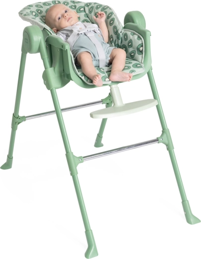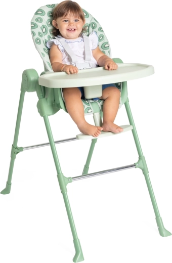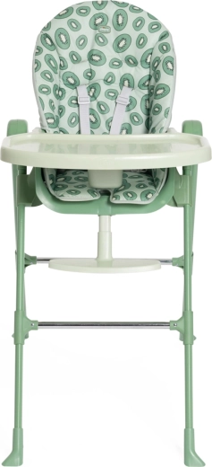 Bezpieczną pozycję zapewniają 5-punktowe pasy oraz stabilne, szeroko rozstawione nogi z wzmocnieniami. Zdejmowana taca daje praktyczną przestrzeń do karmienia i zabaw, a tapicerkę łatwo wyczyścić. Ponadczasowy design i świeży odcień kiwi doskonale pasują do każdego wnętrza.