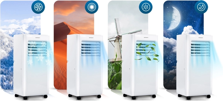 Moc chłodnicza 2,9 kW (10000 BTU) i osuszanie do 26 l/24 h szybko obniżają temperaturę i wilgotność. Idealny do pomieszczeń o objętości 30–40 m³.