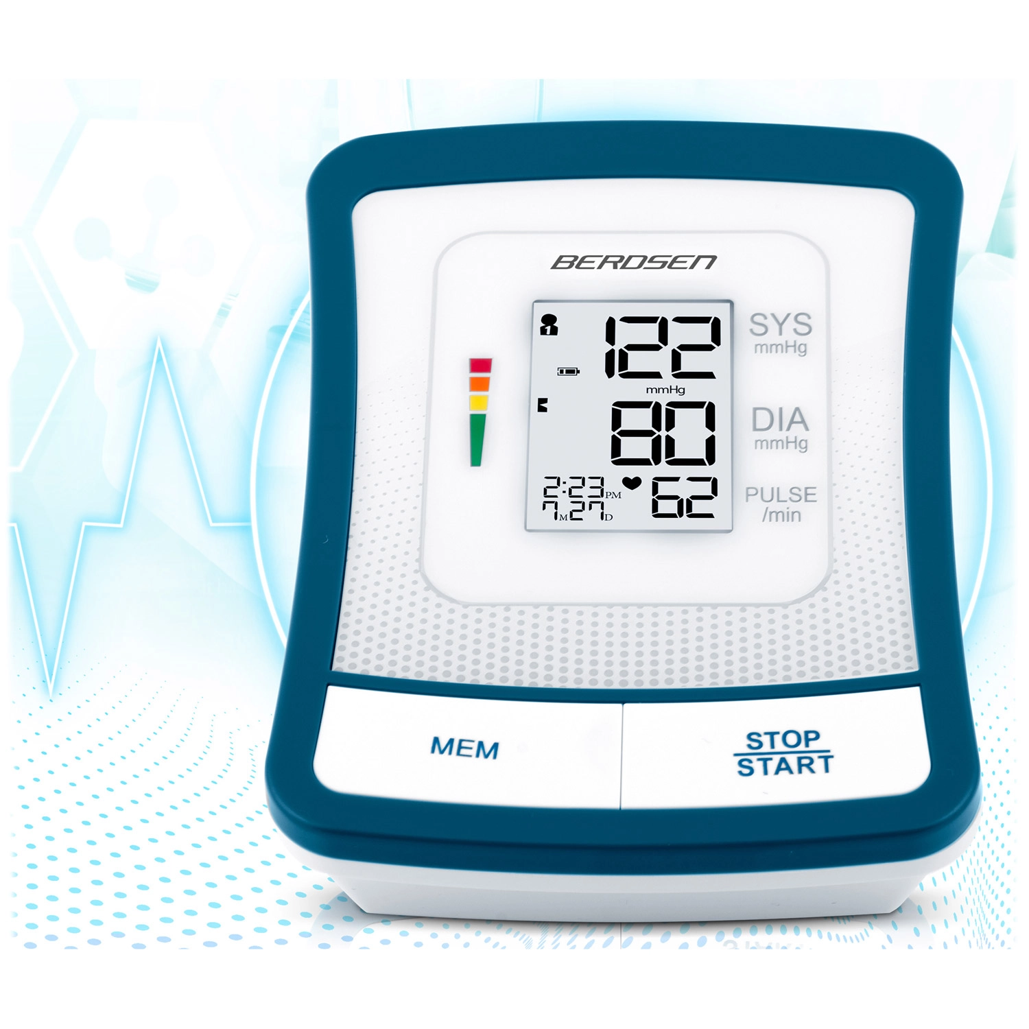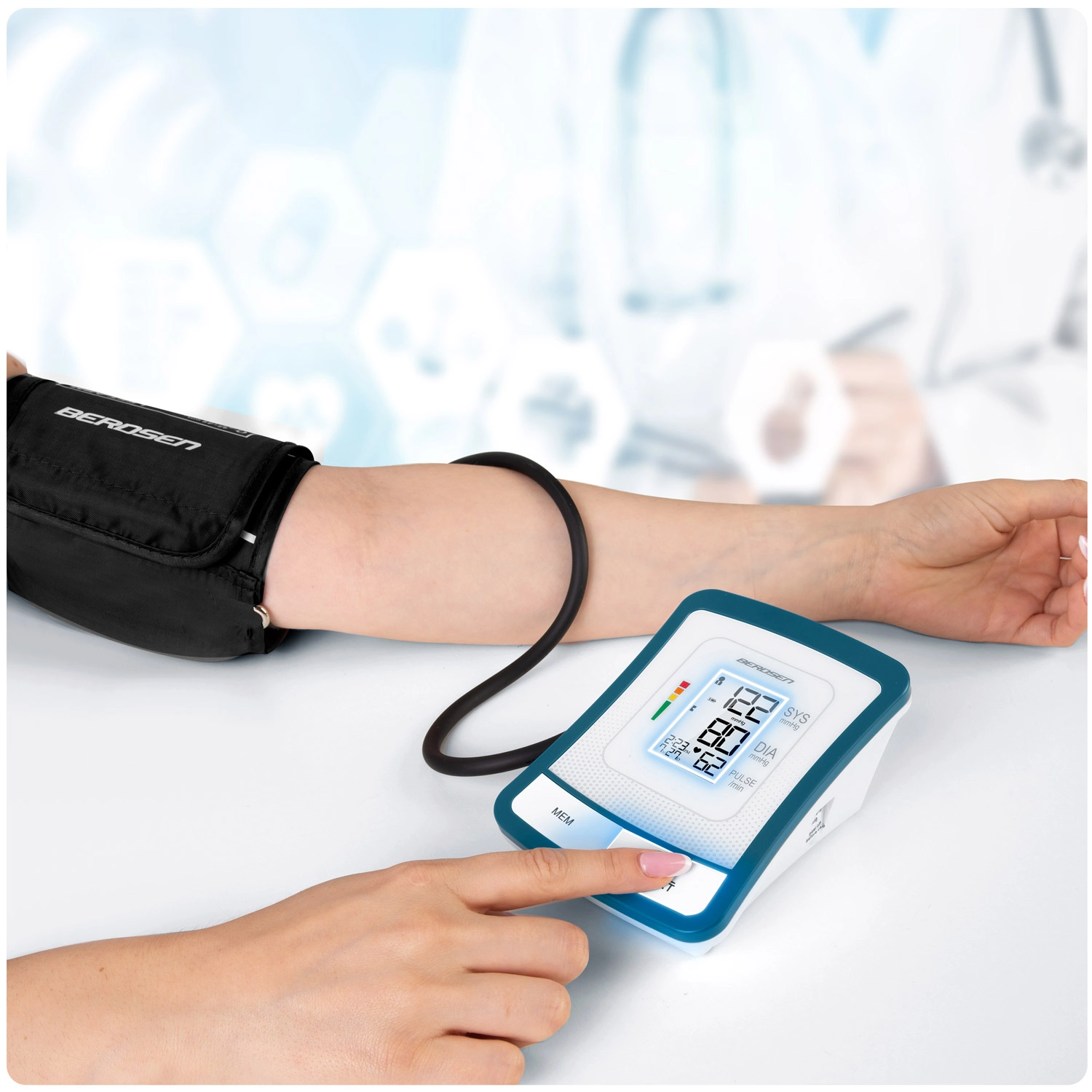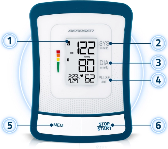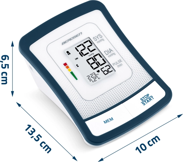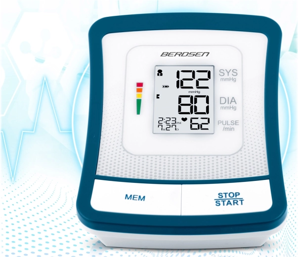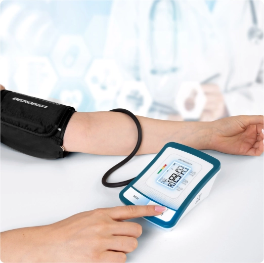 Ciśnieniomierz BERDSEN BD-120 to niezawodny pomocnik do codziennej kontroli zdrowia. Dzięki dużemu wyświetlaczowi LCD z przejrzystą prezentacją skurczu, rozkurczu i pulsu zobaczysz wyniki od razu i bez wysiłku. Urządzenie ostrzega o nieregularnym rytmie serca, posiada sygnalizację dźwiękową, automatyczne wyłączanie oraz wskazanie poziomu baterii.