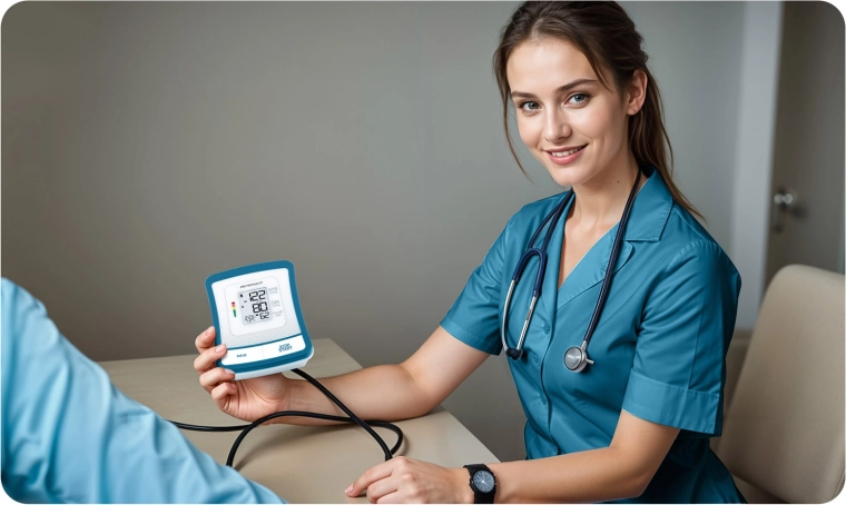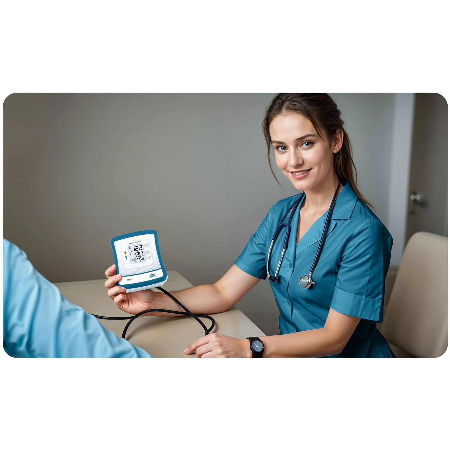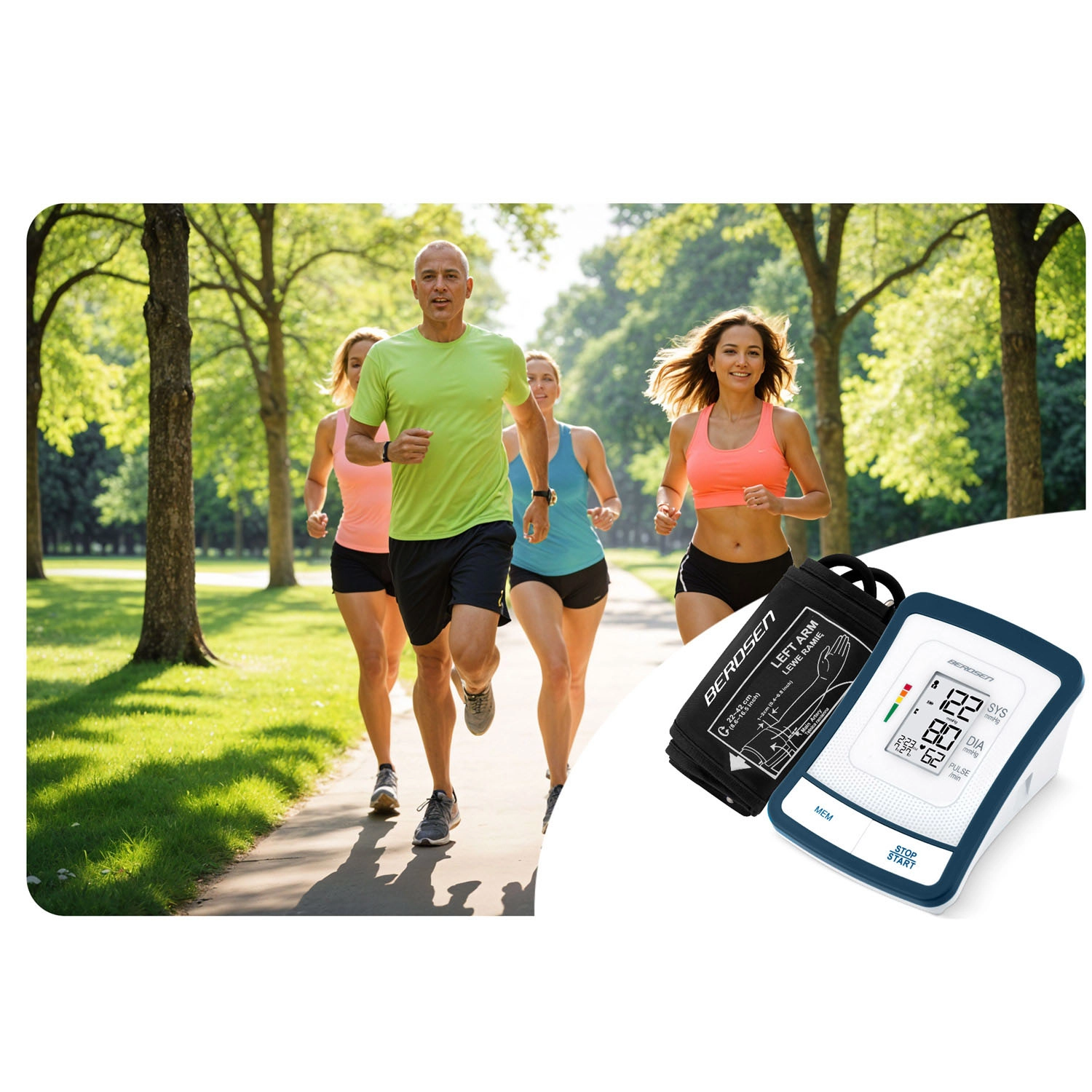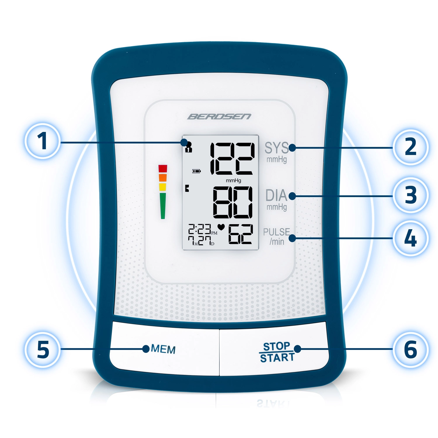 Ciśnieniomierz BERDSEN BD-120 to niezawodny pomocnik do codziennej kontroli zdrowia. Dzięki dużemu wyświetlaczowi LCD z przejrzystą prezentacją skurczu, rozkurczu i pulsu zobaczysz wyniki od razu i bez wysiłku. Urządzenie ostrzega o nieregularnym rytmie serca, posiada sygnalizację dźwiękową, automatyczne wyłączanie oraz wskazanie poziomu baterii.