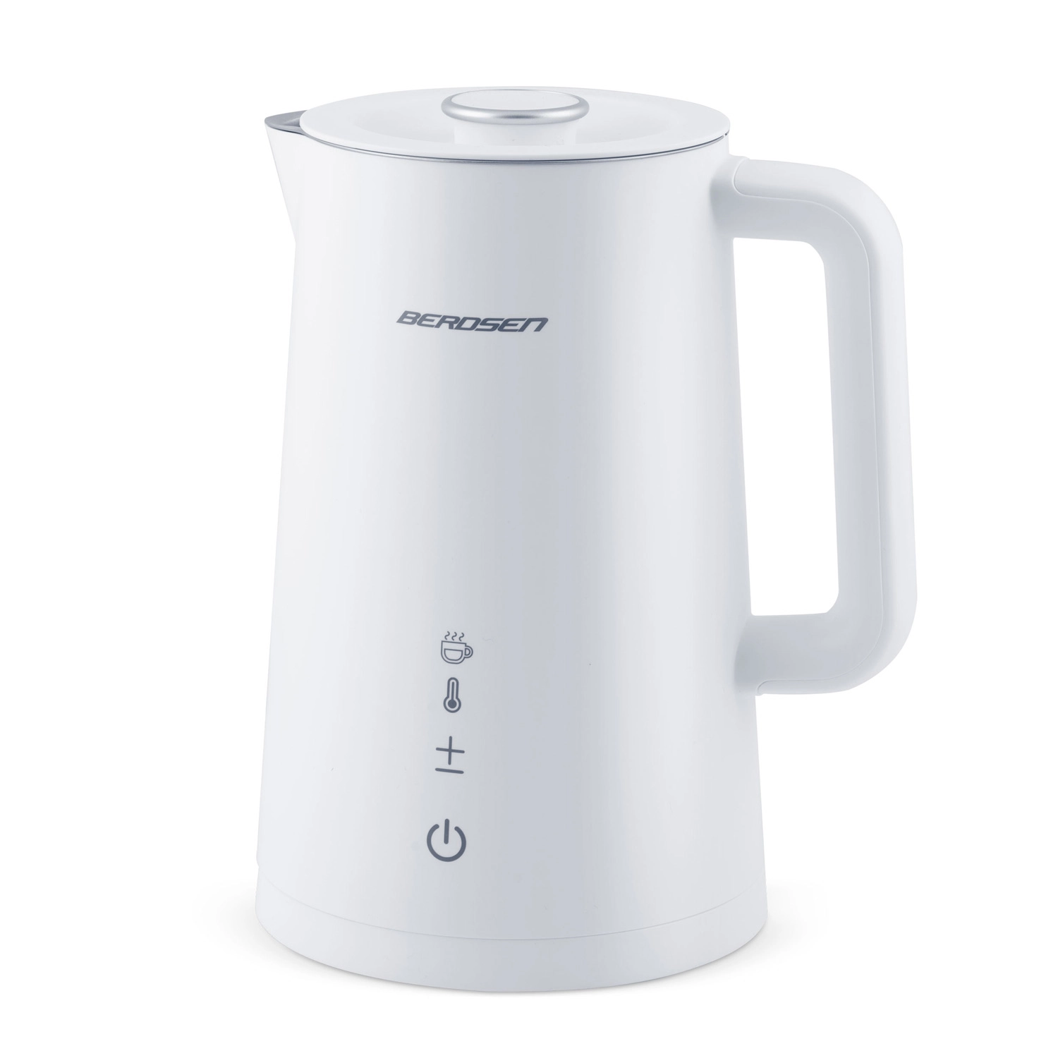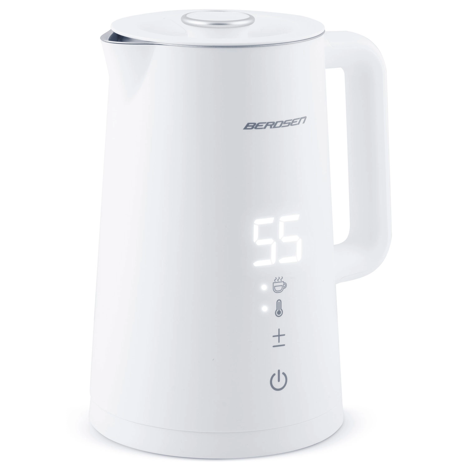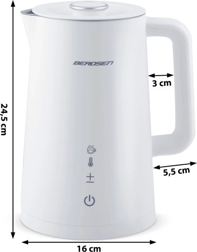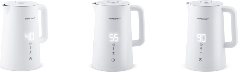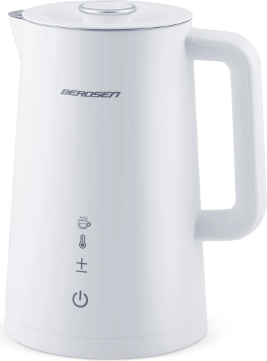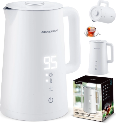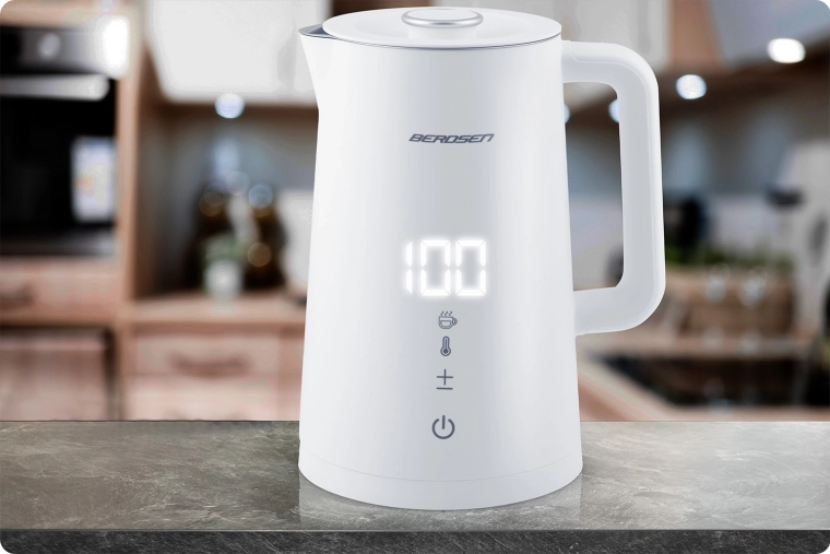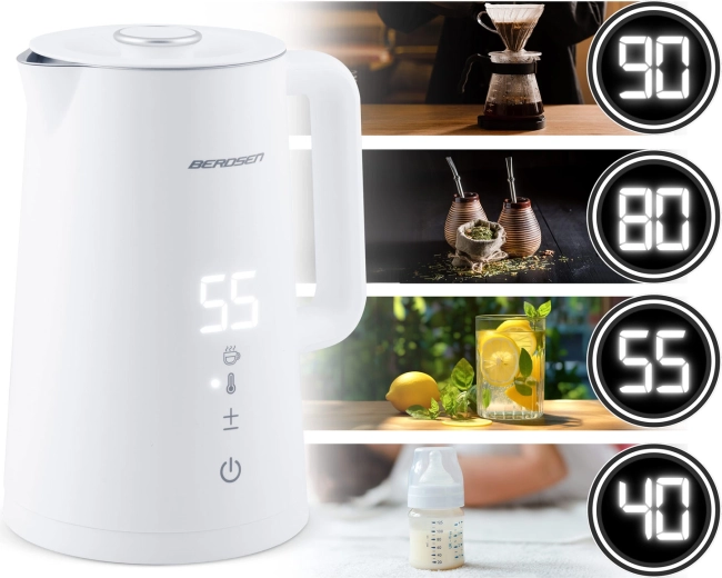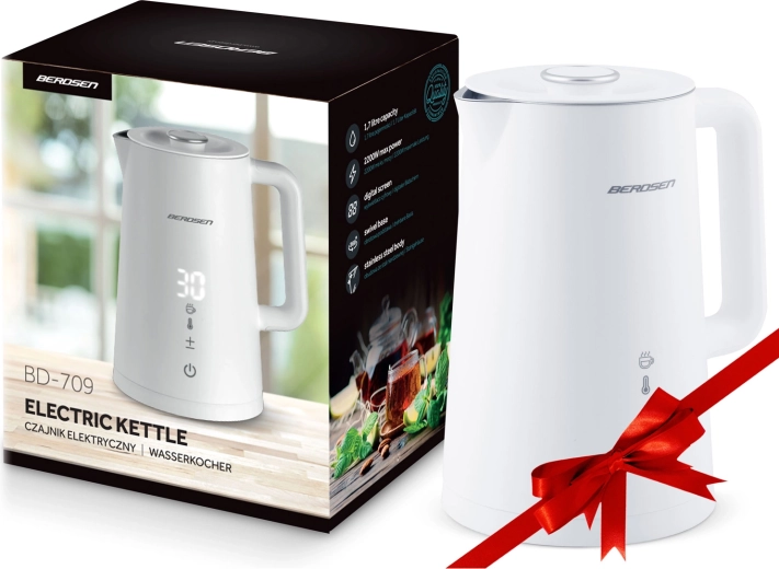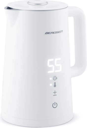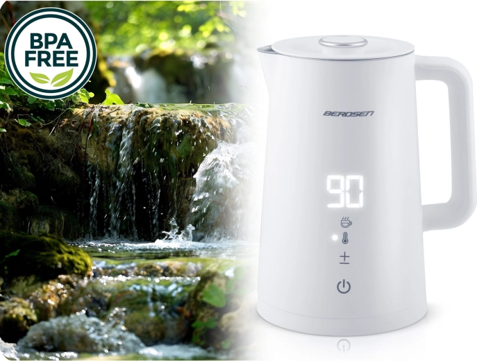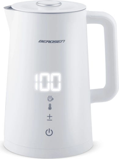 Stylowy elektryczny czajnik BERDSEN o pojemności 1,7 l oferuje precyzyjne ustawienie temperatury w 5 poziomach, panel dotykowy z wyświetlaczem LED, funkcję utrzymania temperatury do 2 godzin oraz bezpieczną, dwuścienną konstrukcję CoolTouch. Wnętrze ze stali nierdzewnej SUS 304 gwarantuje czysty smak wody i długą żywotność urządzenia.