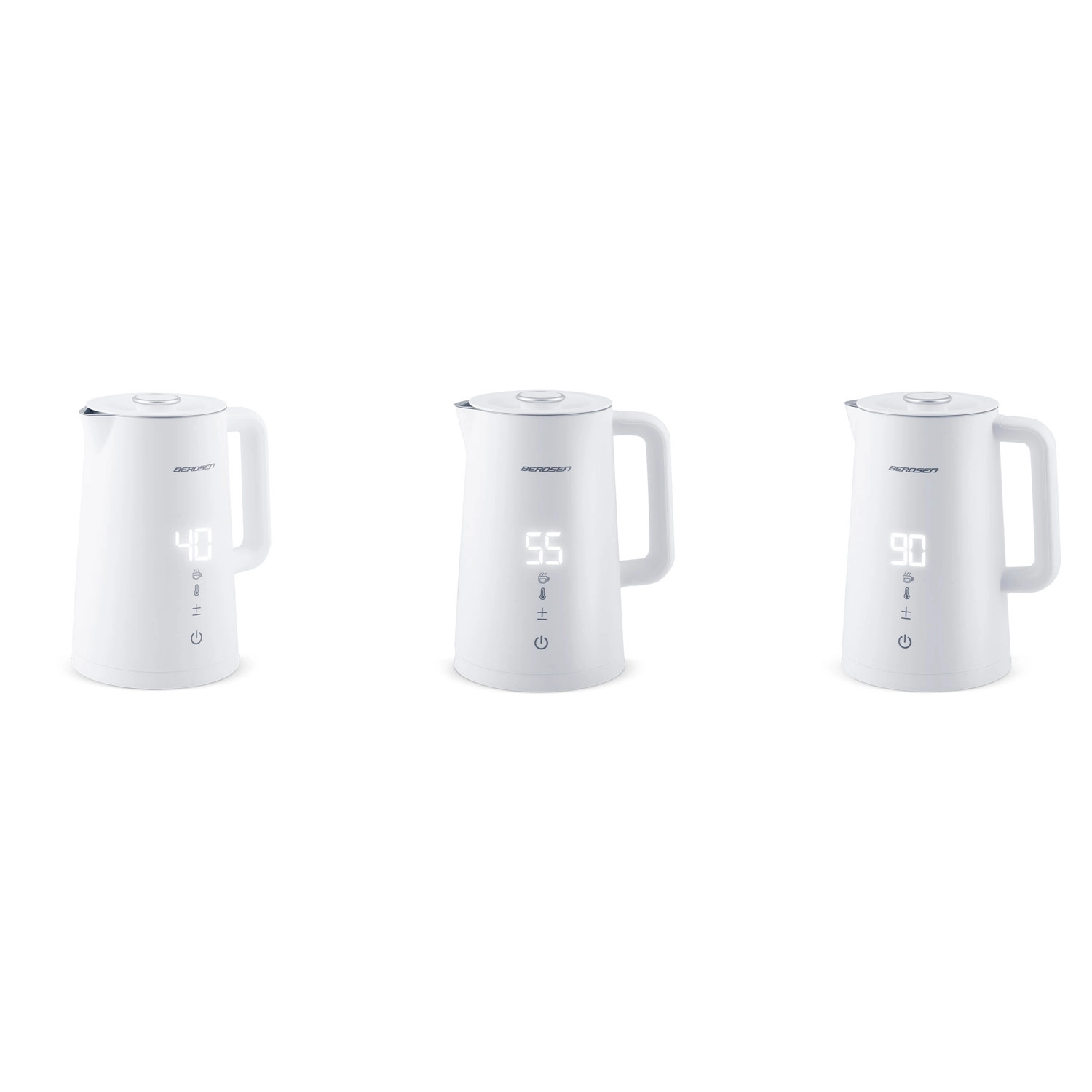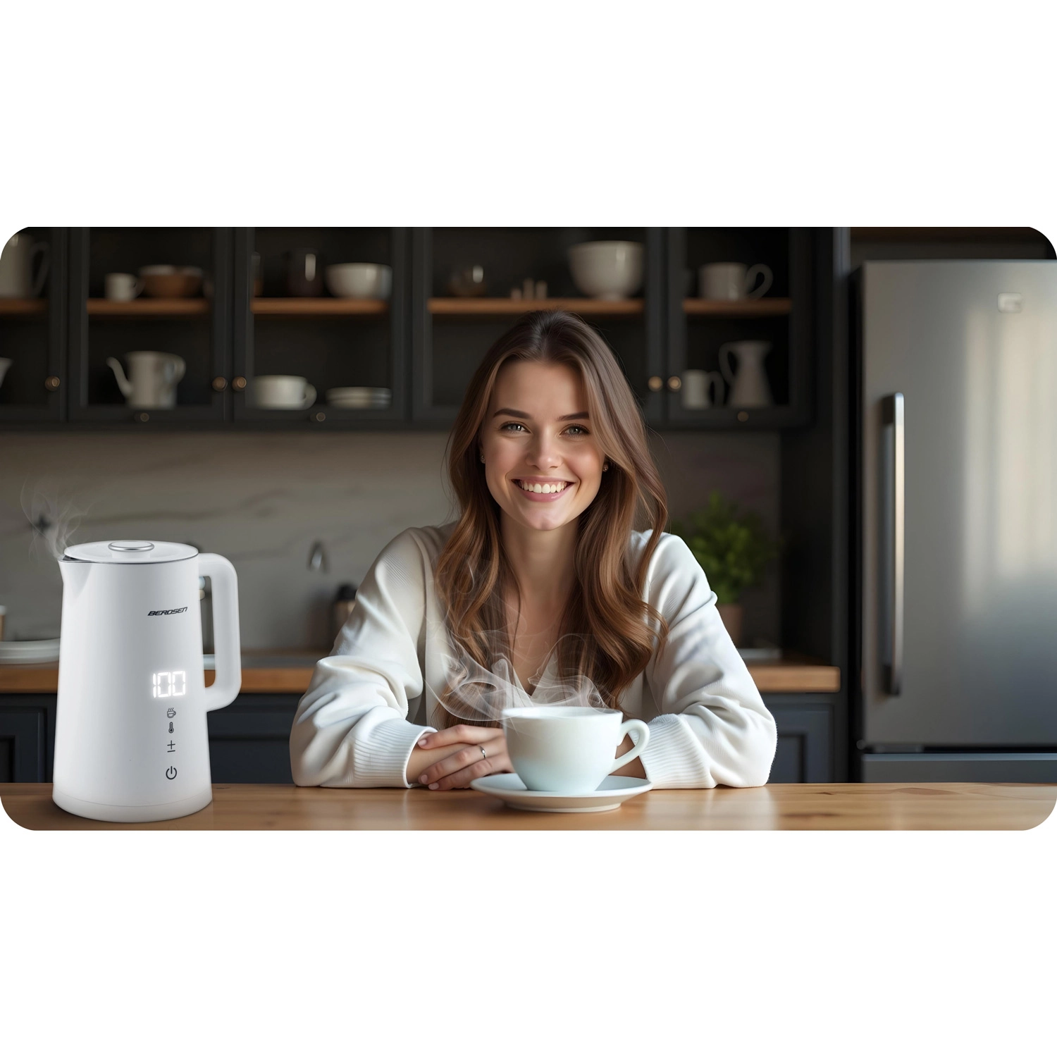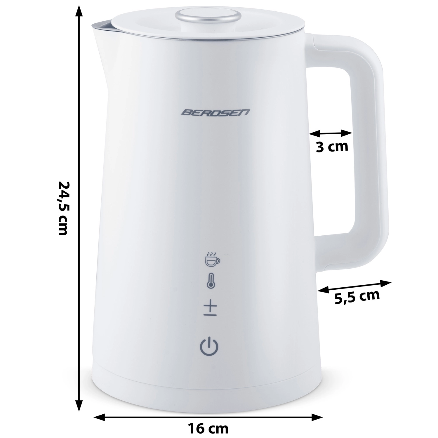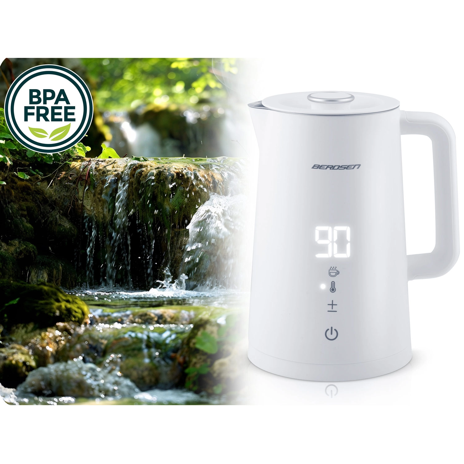Stylowy elektryczny czajnik BERDSEN o pojemności 1,7 l oferuje precyzyjne ustawienie temperatury w 5 poziomach, panel dotykowy z wyświetlaczem LED, funkcję utrzymania temperatury do 2 godzin oraz bezpieczną, dwuścienną konstrukcję CoolTouch. Wnętrze ze stali nierdzewnej SUS 304 gwarantuje czysty smak wody i długą żywotność urządzenia.