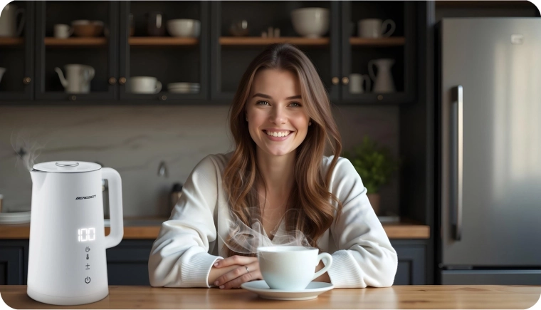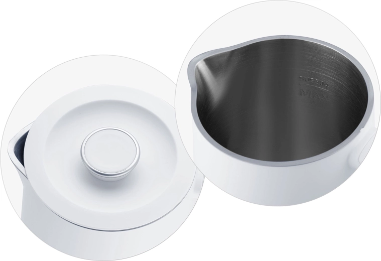 Wewnętrzny zbiornik ze stali nierdzewnej SUS 304 (bez BPA) gwarantuje bezpieczeństwo kontaktu z wodą, czysty smak i wysoką trwałość. Czajnik wyposażono w obrotową podstawę 360° z antypoślizgowymi nóżkami i praktyczny schowek na przewód, dzięki czemu sprawdzi się w każdej kuchni.