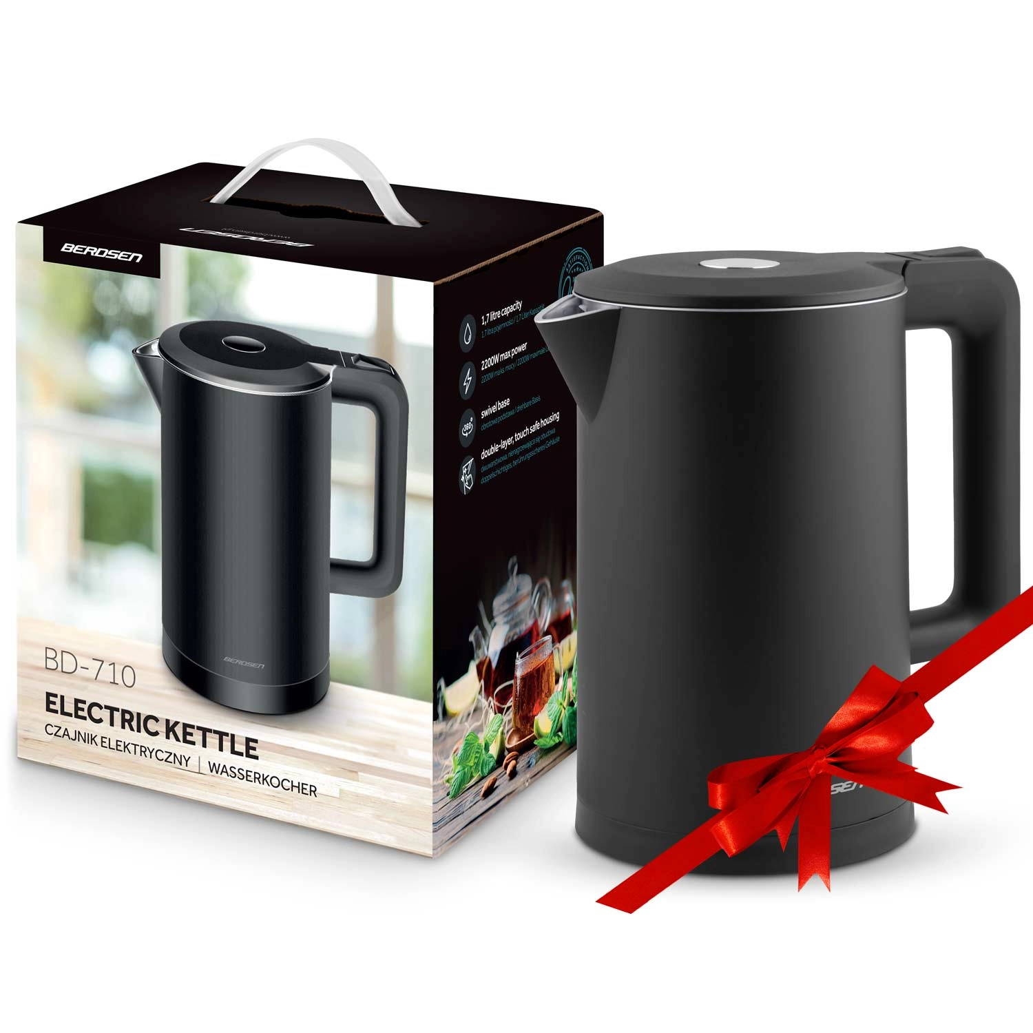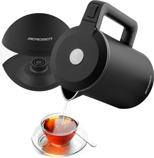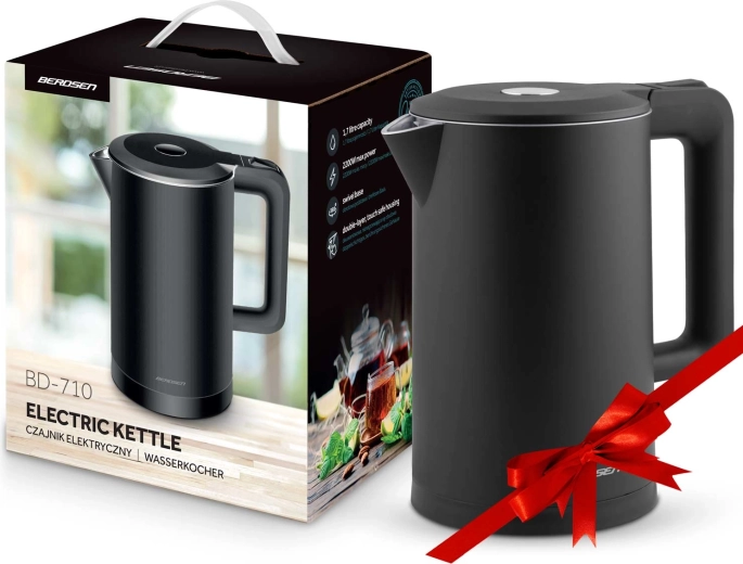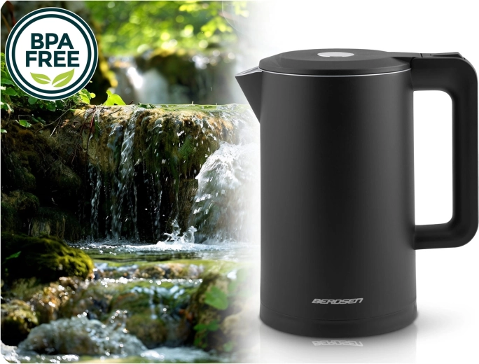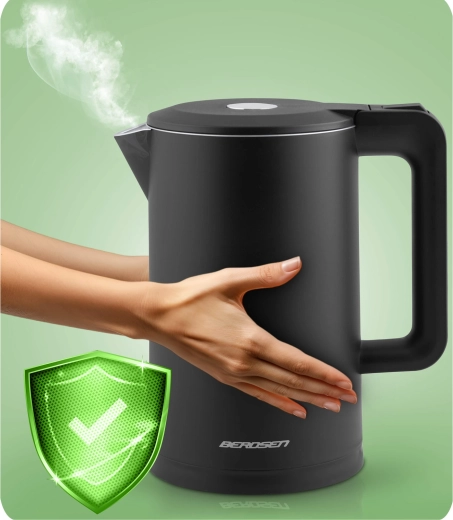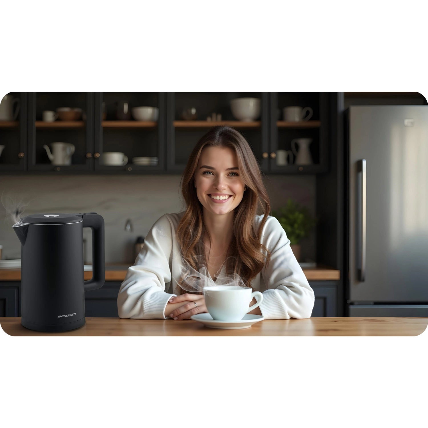Stylowy czajnik elektryczny BERDSEN o pojemności 1,7 l łączy stal nierdzewną SUS304 dla czystego smaku wody oraz izolowaną konstrukcję CoolTouch™ dla bezpiecznego użytkowania bez ryzyka oparzeń. Oferuje moc 1850–2200 W dla szybkiego gotowania, obrotową podstawę 360°, podświetlany pasek LED oraz przemyślane detale, takie jak schowek na kabel i antypoślizgowe nóżki.