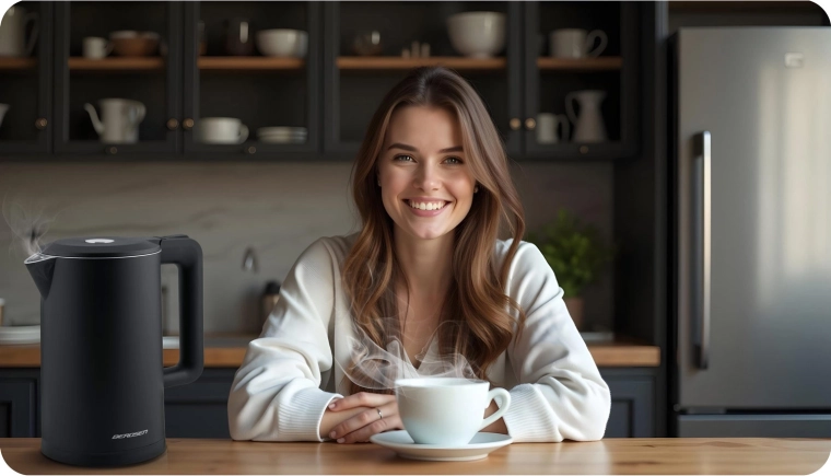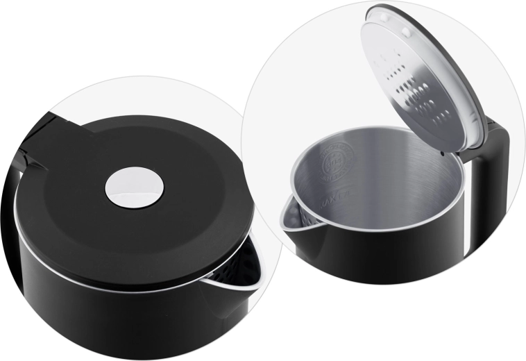 Odkryj minimalistyczny design, który wpasuje się w każdą kuchnię. Wnętrze ze stali nierdzewnej SUS304 jest trwałe, higieniczne i wolne od BPA, dzięki czemu woda pozostaje czysta i bez niepożądanych posmaków. Dwuwarstwowa izolowana konstrukcja CoolTouch™ chroni przed gorącą powierzchnią i lepiej zatrzymuje ciepło dla większej efektywności.
