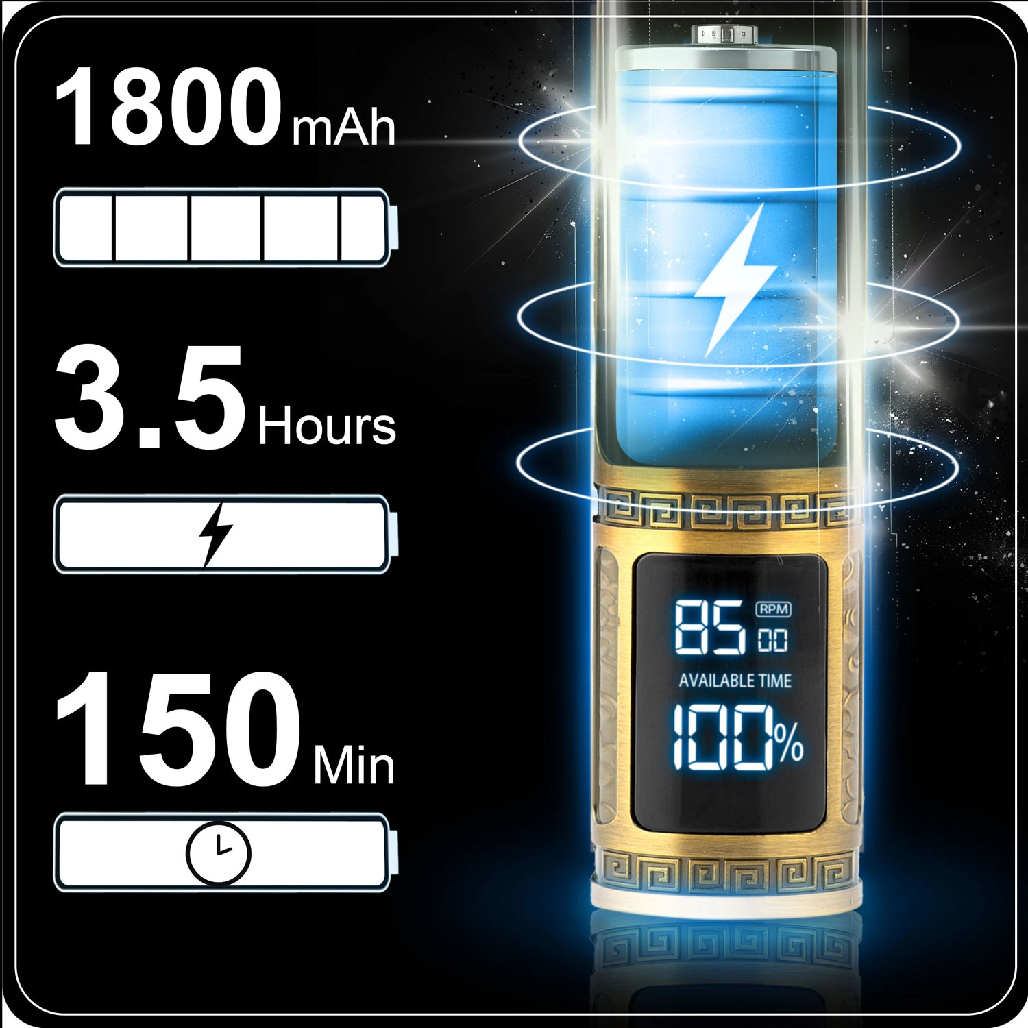 Monitoruj pozostały czas i stan baterii na czytelnym ekranie LCD. Akumulator Li‑Ion 1800 mAh zapewnia do 2,5 godziny pracy – idealnie do pełnej stylizacji włosów i brody.