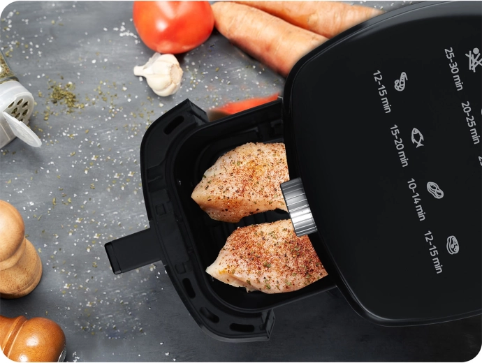 Technologia cyrkulacji gorącego powietrza gwarantuje chrupiącą skórkę i soczysty środek bez przypalonego oleju, zapachu i zbędnych kalorii.