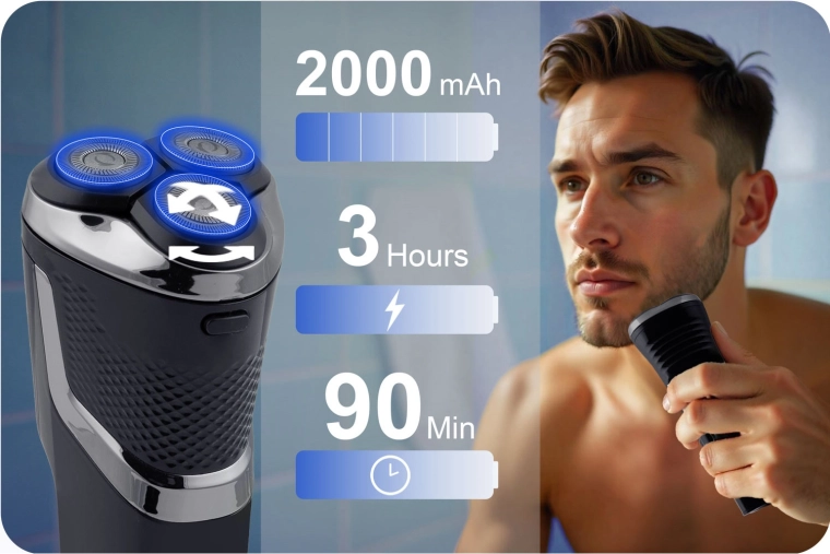 Mocny silnik gwarantuje stabilną wydajność, a pojemny akumulator Li‑Ion 2000 mAh zapewnia do 3 godzin nieprzerwanej pracy. Dzięki szybkiemu ładowaniu przez USB‑C golarka jest gotowa do użycia już po 1,5 godziny. Kompaktowy, ergonomiczny kształt świetnie leży w dłoni, a funkcja Travel Lock zapobiega przypadkowemu włączeniu w podróży.