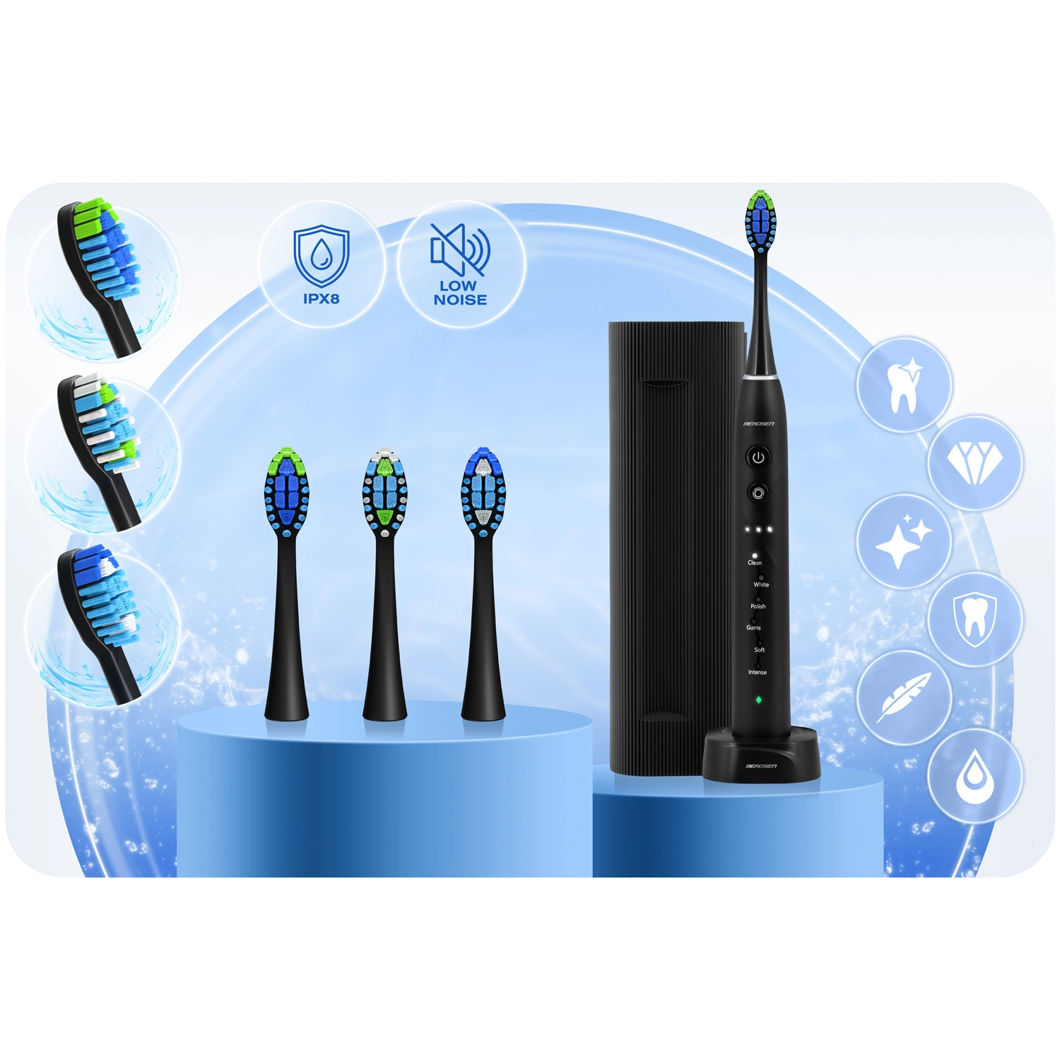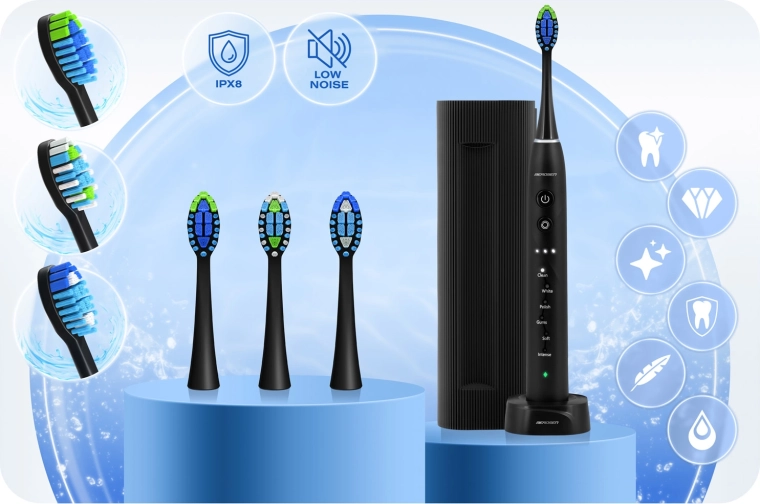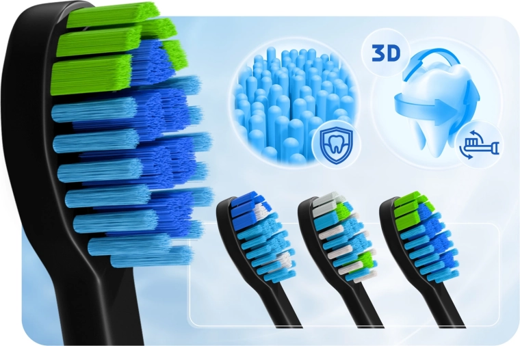 Technologia soniczna Berdsen Galaxy dociera nawet do trudno dostępnych przestrzeni międzyzębowych i pomaga usunąć do 6× więcej płytki niż szczoteczka manualna. Specjalnie wyprofilowana główka z delikatnymi, cienkimi włóknami dopasowuje się do każdego zęba, a tylną stroną z łatwością wyczyścisz także język, zapewniając długotrwałą świeżość oddechu. Stylowe czarne wykończenie uzupełnia ergonomiczny uchwyt oraz cicha, profesjonalna praca.