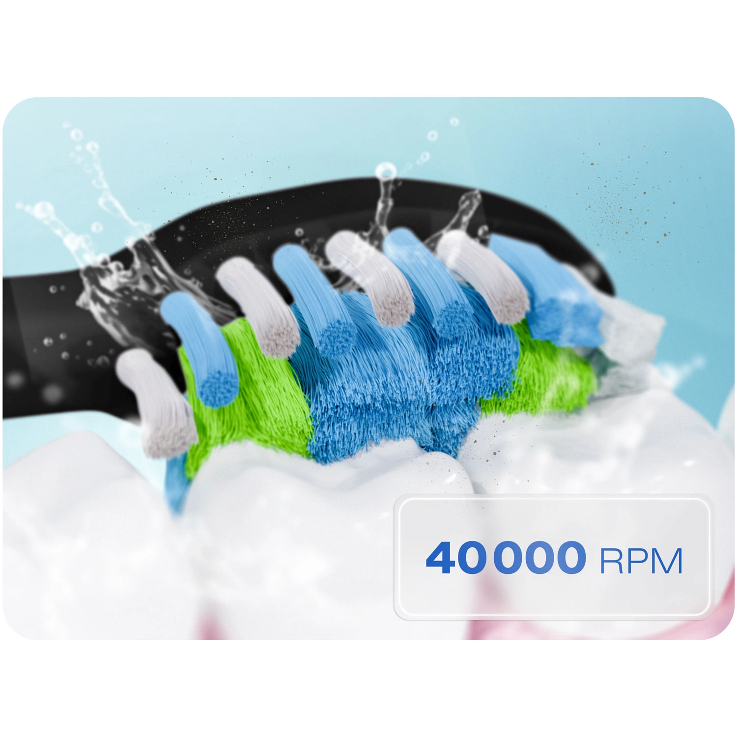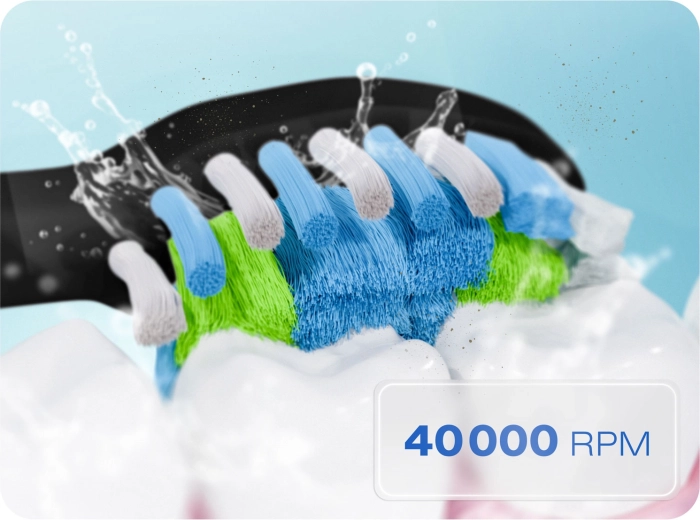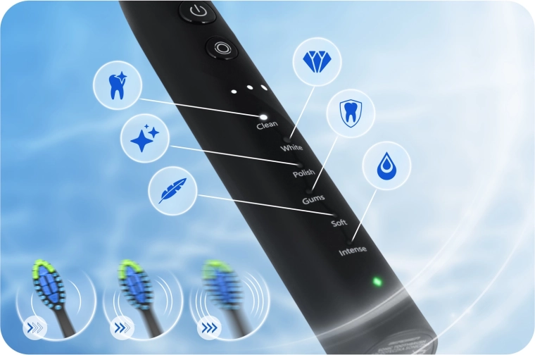 Wybierz spośród 18 kombinacji czyszczenia – 6 trybów (CLEAN, WHITE, POLISH, GUMS, SOFT, INTENSE) i 3 poziomów intensywności, aby idealnie dopasować działanie do swoich potrzeb. Wydajny silnik 40 000 wibracji/min skutecznie rozbija płytkę nazębną i przebarwienia, a 2‑minutowy timer z 30‑sekundowymi przerwami prowadzi do prawidłowego podziału jamy ustnej na kwadranty.