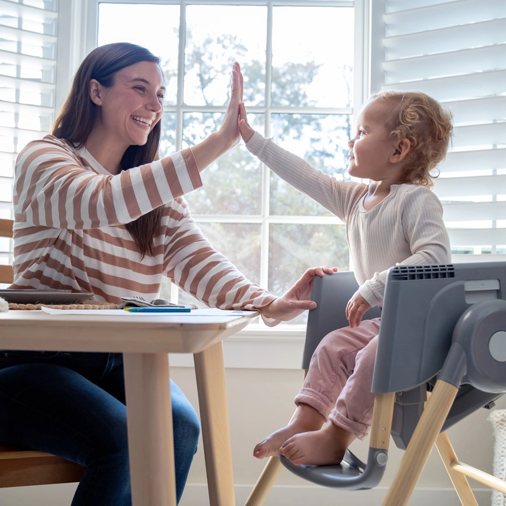Rodzice docenią tackę z 3 pozycjami z uchwytem na napój i wyjmowaną wkładką do zmywarki, pokrowce do prania oraz pasy bezpieczeństwa, które dopasowują się do wieku dziecka. Regulowana wysokość i wygodny podnóżek wspierają zdrowe siedzenie w kącie 90/90/90, aby nogi nie zwisały, a dziecko siedziało stabilnie przy stole.