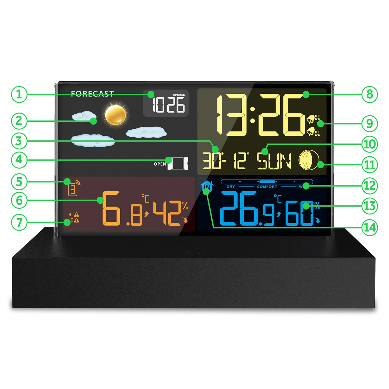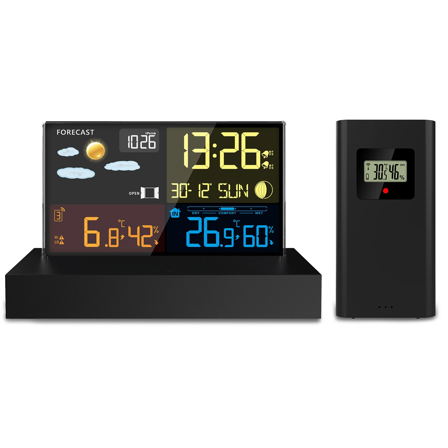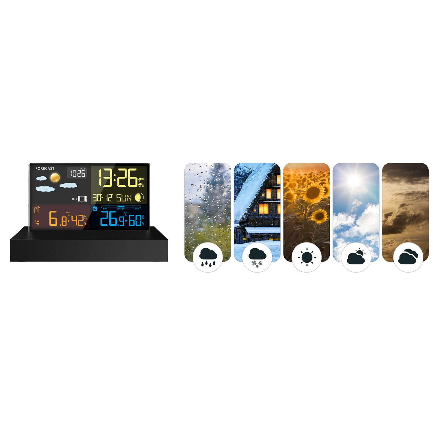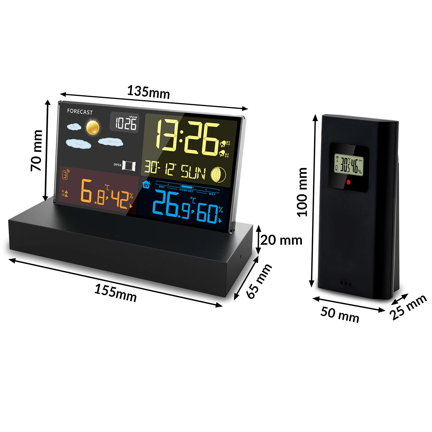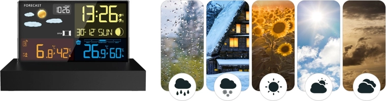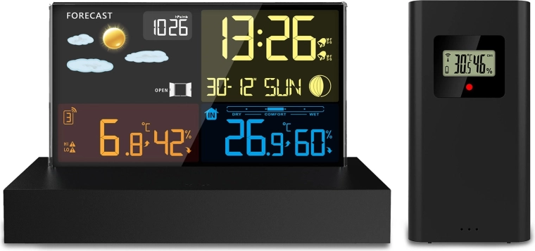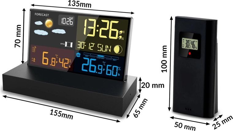 - Czytelny kolorowy LCD z ikonami pogody, fazami Księżyca i wskaźnikiem baterii