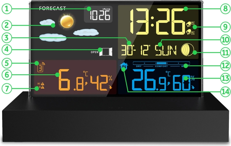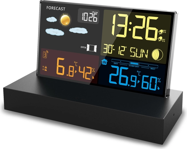 Duży kolorowy wyświetlacz pokazuje czas, datę, temperaturę, wilgotność, ikony pogody i trendy. Stacja analizuje ciśnienie, temperaturę i wilgotność, dostarczając dokładną krótkoterminową prognozę.