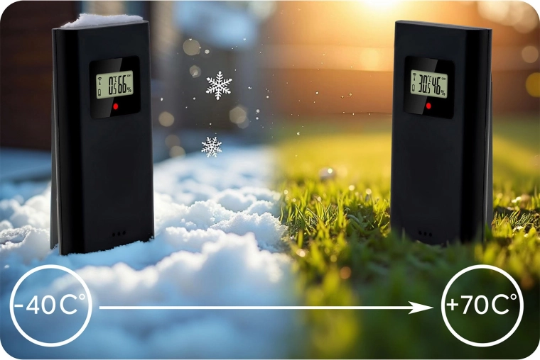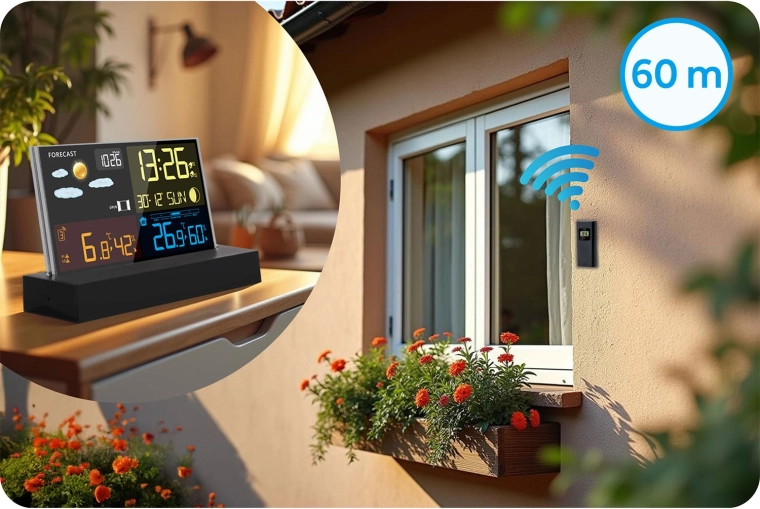 - Szerokie zakresy pomiarowe: wewnątrz od -9,9 do 50 °C, na zewnątrz od -40 do 70 °C, wilgotność 20–95% RH, ciśnienie 850–1100 hPa
