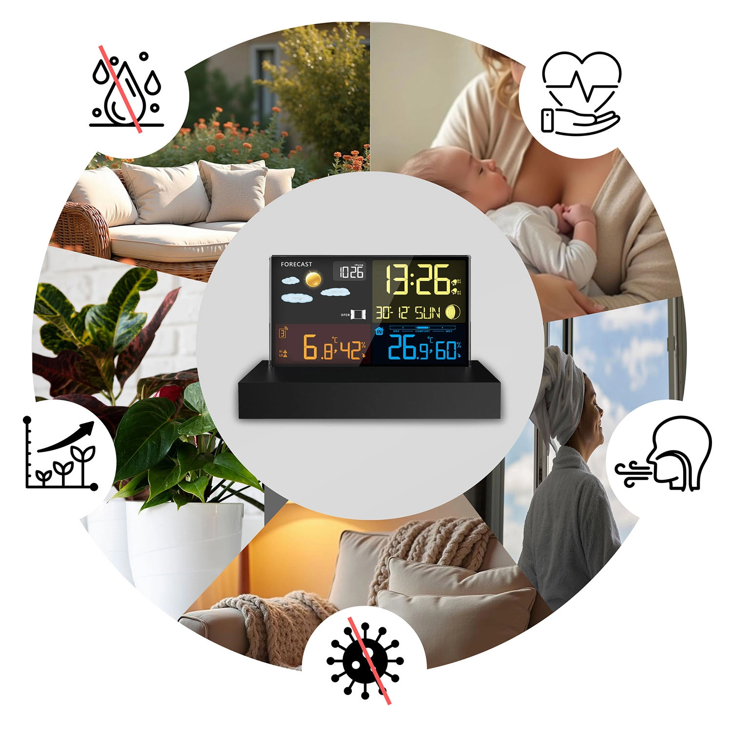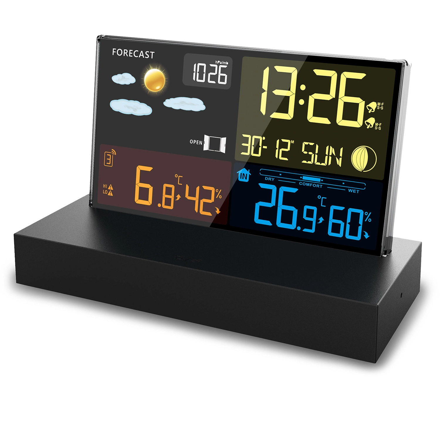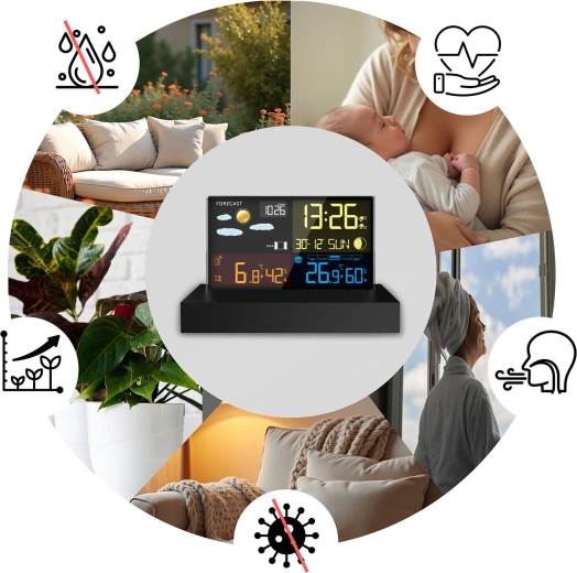 Zegar radiowy DCF, budzik z funkcją drzemki oraz wskaźnik komfortu pomagają zarządzać codziennym rytmem i zdrowym klimatem w pomieszczeniu.