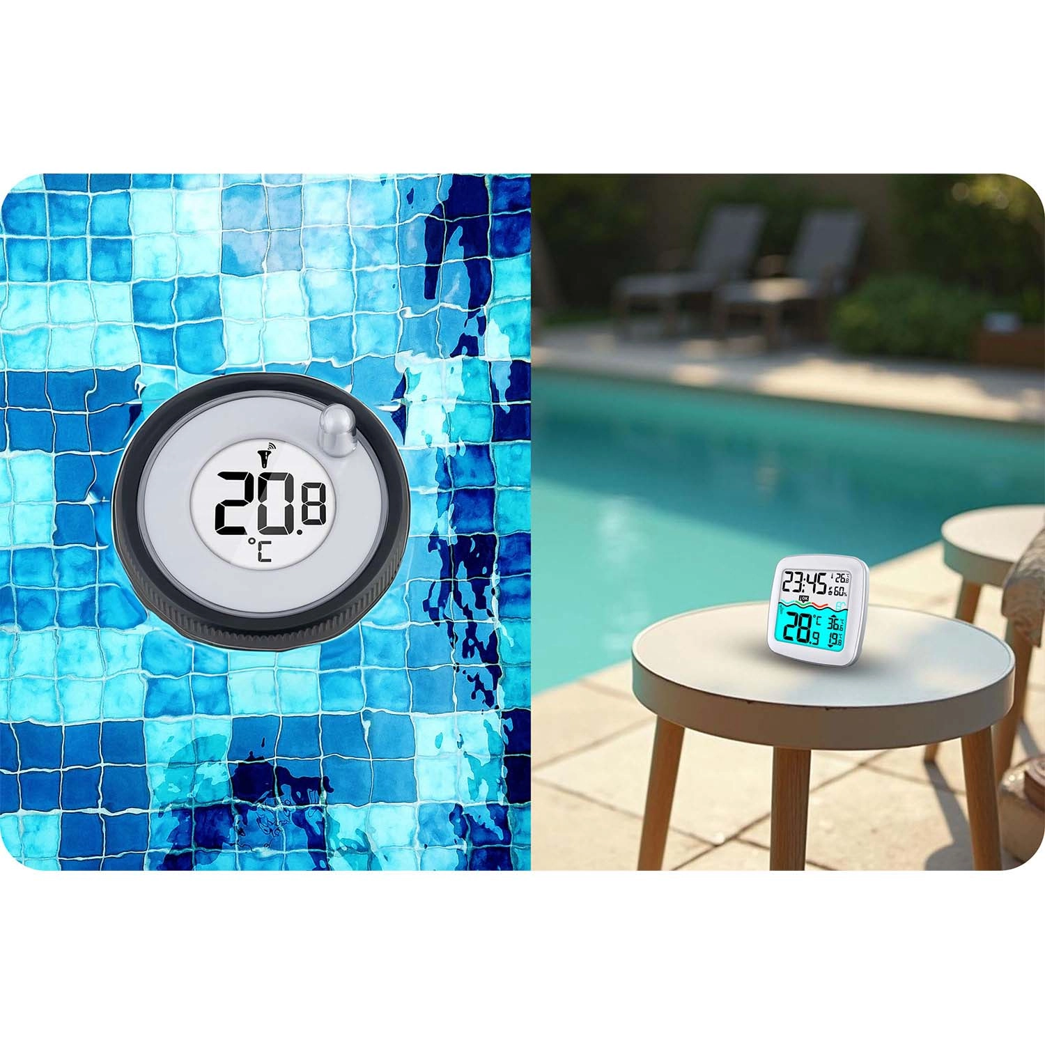 Pływający czujnik precyzyjnie mierzy temperaturę wody, a jednostka wewnętrzna wyświetla poziom komfortu, kanał czujnika oraz wartości min./max. dla długoterminowego monitoringu. Kompaktowe, lśniąco białe wykończenie świetnie wpisuje się w nowoczesne otoczenie, a dzięki zasilaniu bateryjnemu instalacja zajmuje chwilę.