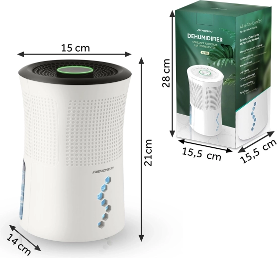 Kompaktowy osuszacz powietrza BERDSEN BD-527 zapewnia zdrowy klimat w domu i skutecznie redukuje nadmierną wilgotność. Oferuje cichą pracę do 34 dB, duży zbiornik 700 ml, technologię Peltiera o niskim zużyciu 22,5 W oraz dekoracyjne podświetlenie LED z możliwością wyłączenia. Idealny do łazienki, pralni i mniejszych pomieszczeń, aby zapobiegać pleśni, nieprzyjemnym zapachom i przyspieszyć suszenie prania.
