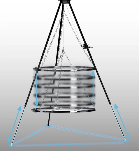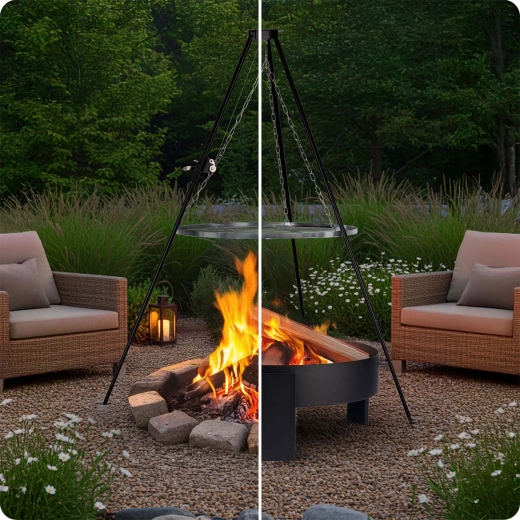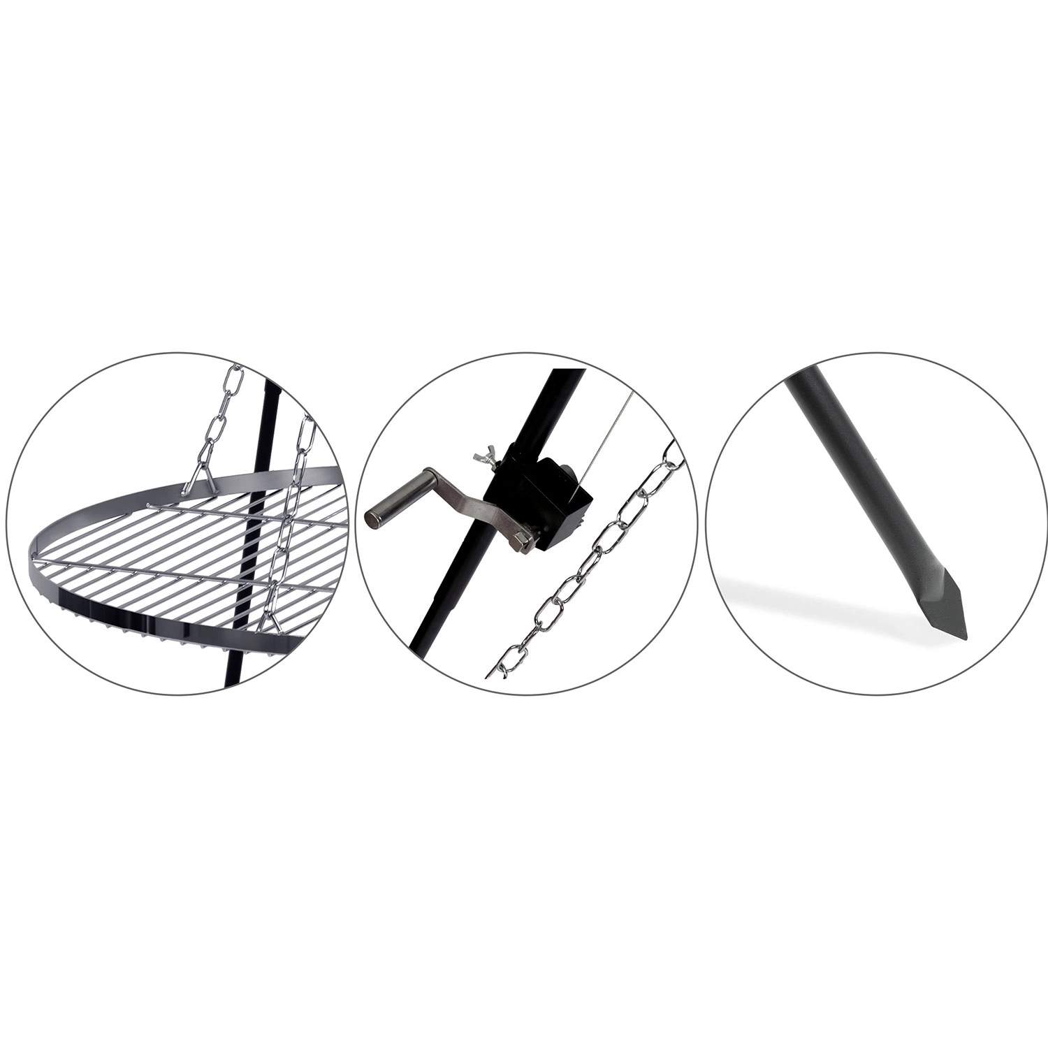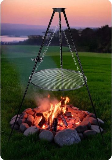 Stabilne, ostro zakończone nogi do wbicia w ziemię oraz niezawodny mechanizm podnoszenia z blokadą zapewniają bezpieczną obsługę. Grill świetnie sprawdzi się w ogrodach, na biwakach i przy paleniskach – wnosi atmosferę otwartego ognia i niepowtarzalny smak potraw.