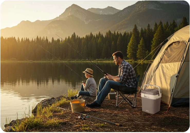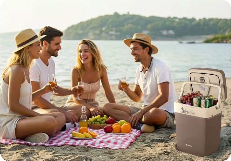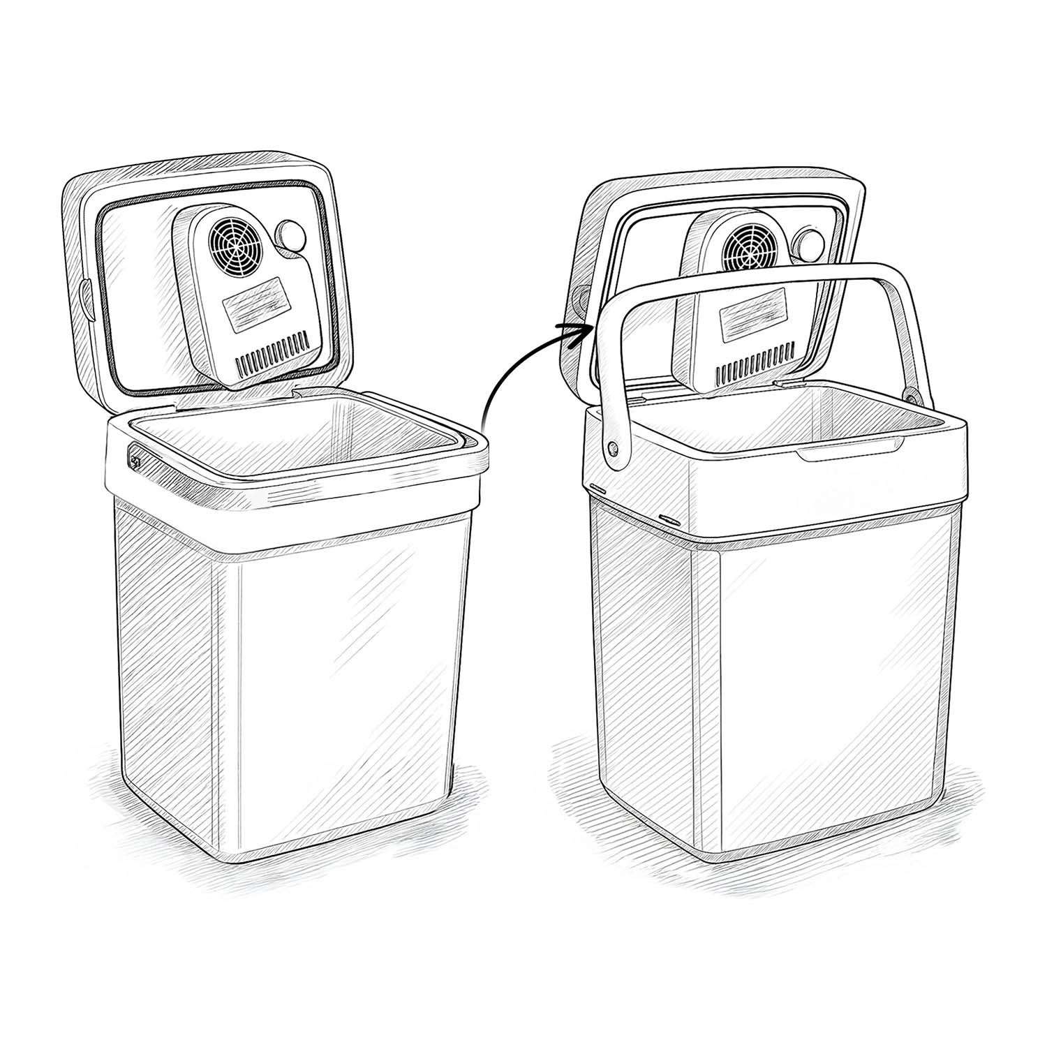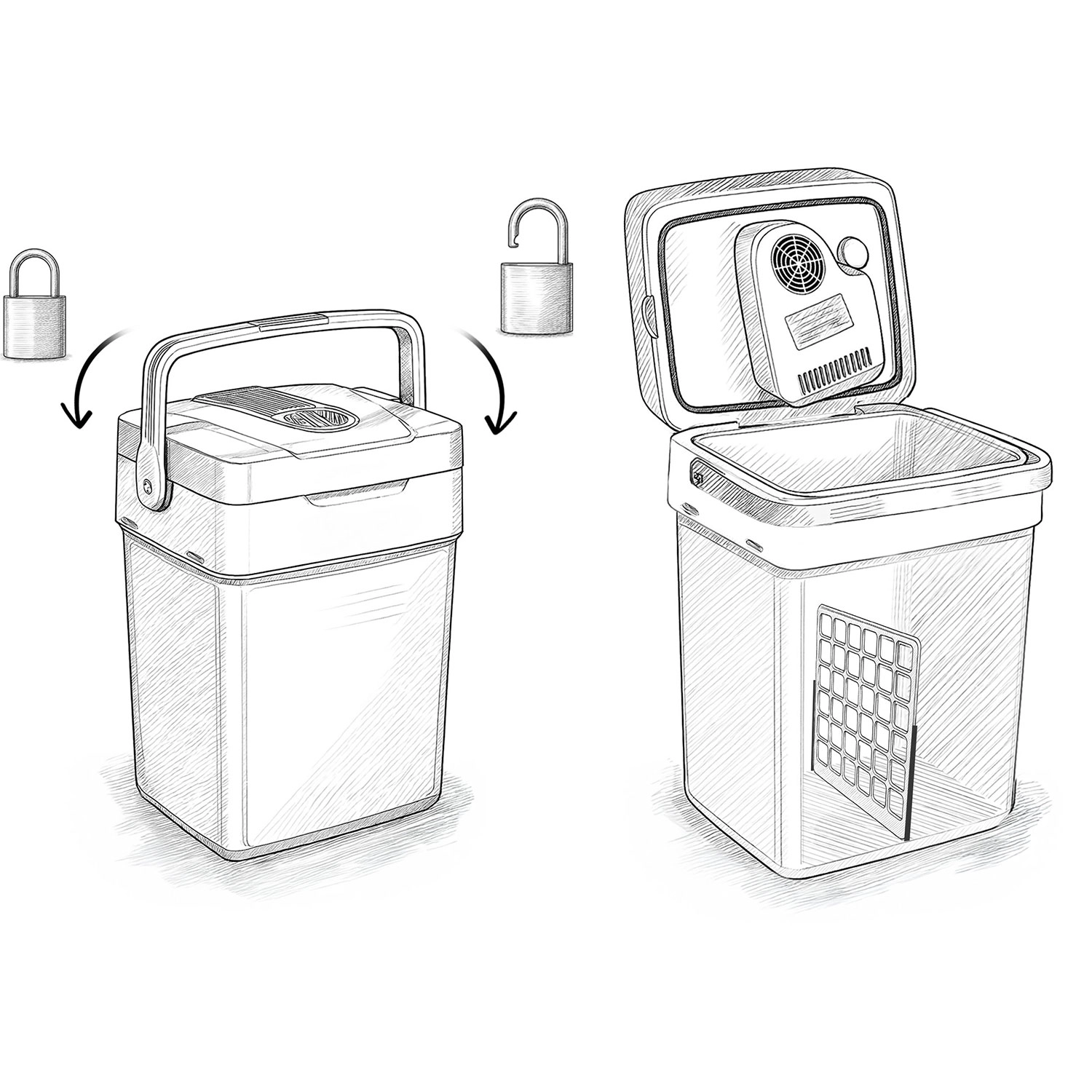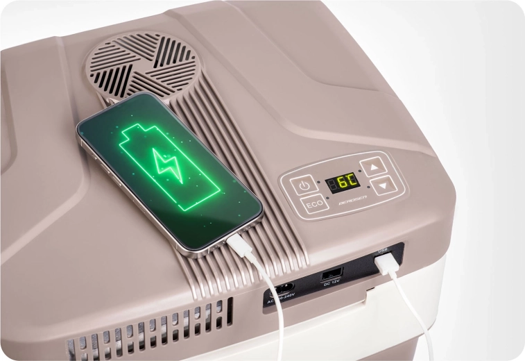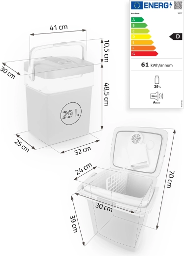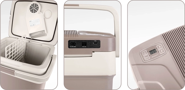 Dzięki podwójnemu zasilaniu 12 V (samochód) i 220–240 V (sieć) wykorzystasz ją w podróży i w domu. Praktyczne elementy, takie jak blokada pokrywy podczas noszenia, składany uchwyt jako podpórka oraz wewnętrzna przegroda–kratka, ułatwiają pakowanie i organizację żywności oraz napojów. Cicha praca od 26 dB w trybie ECO nie zakłóca odpoczynku nawet w nocy.