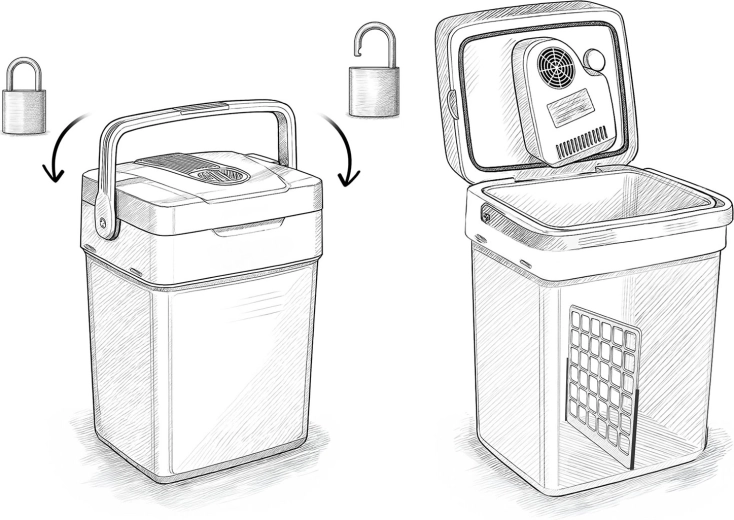 Składany uchwyt służy także jako podpórka pokrywy, zamek zapobiega przypadkowemu otwarciu, a wewnętrzna przegroda–kratka pomaga w organizacji żywności i napojów.