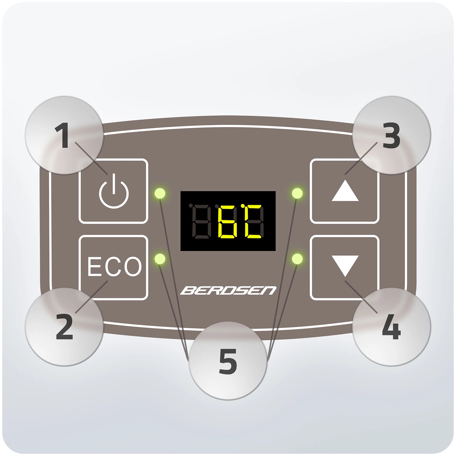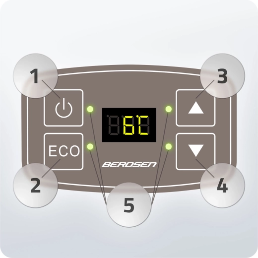 - Łatwa obsługa: przycisk ON/OFF, wybór trybu ECO, precyzyjne ustawienie temperatury, diody sygnalizacyjne.