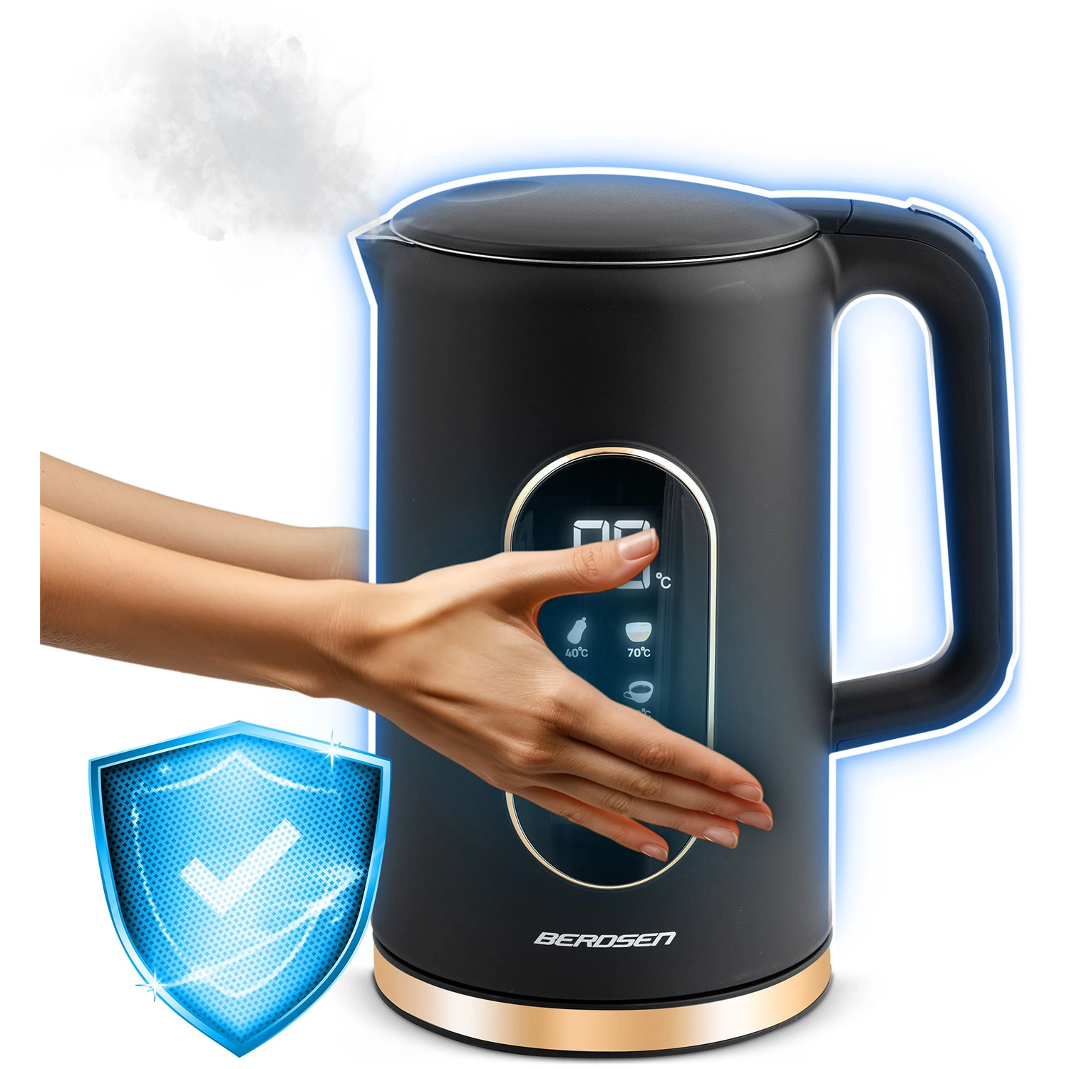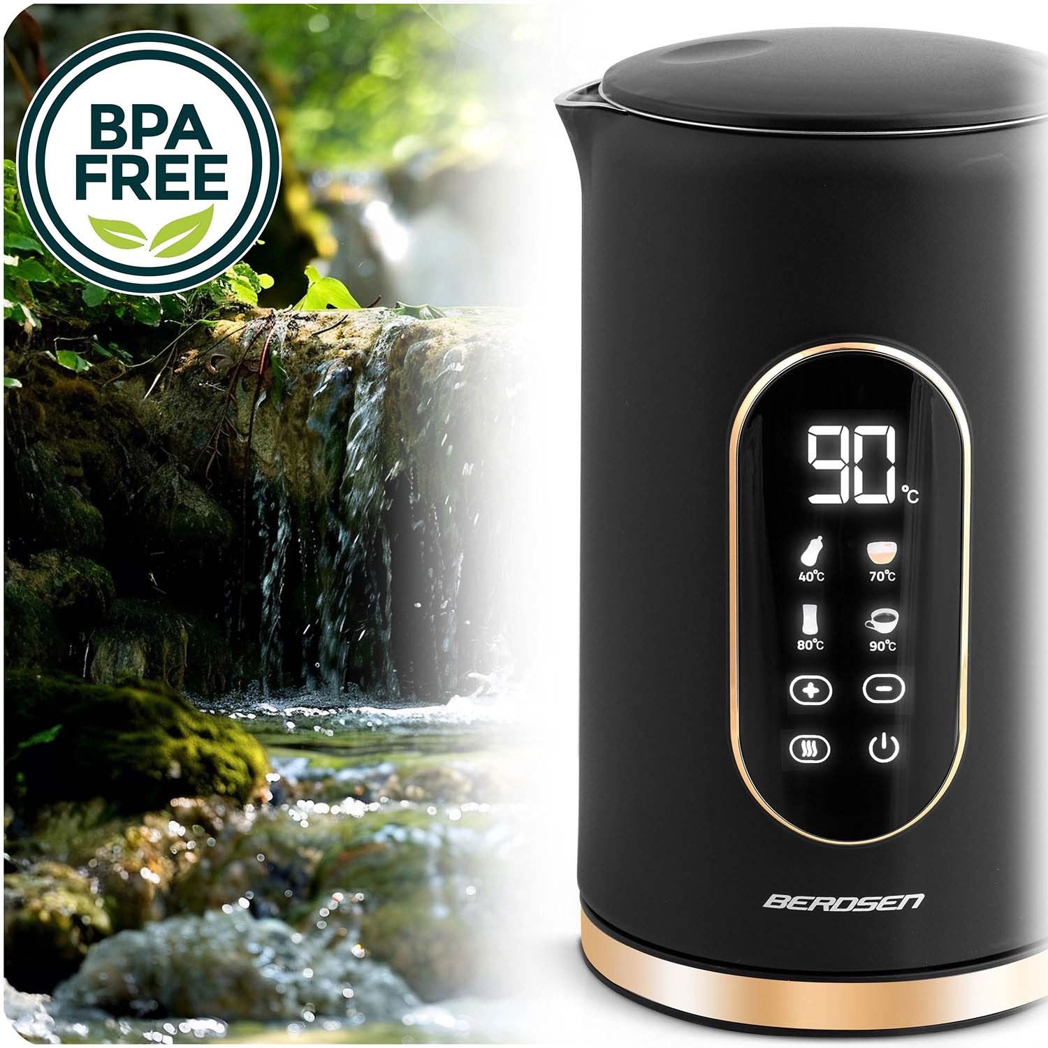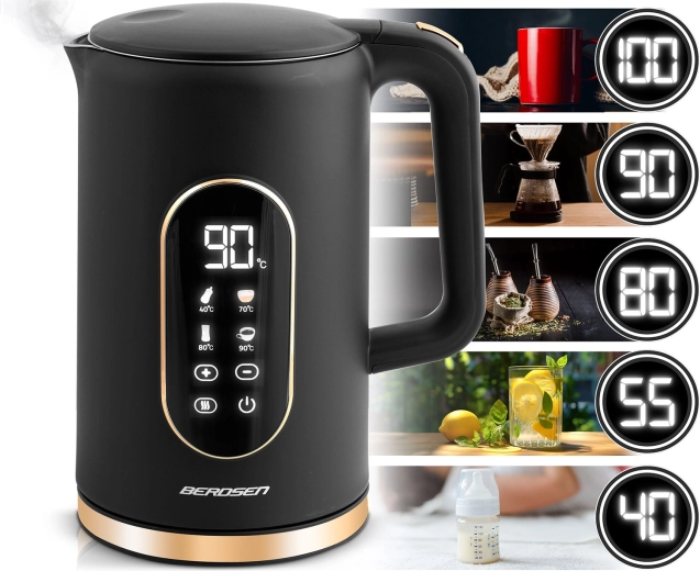 Dotykowe sterowanie Soft Touch, presety 40/70/80/90/100 °C i delikatne kroki co 5 °C. Idealny do kawy, herbat oraz napojów dla dzieci, z funkcją podtrzymania temperatury do 2 godzin.