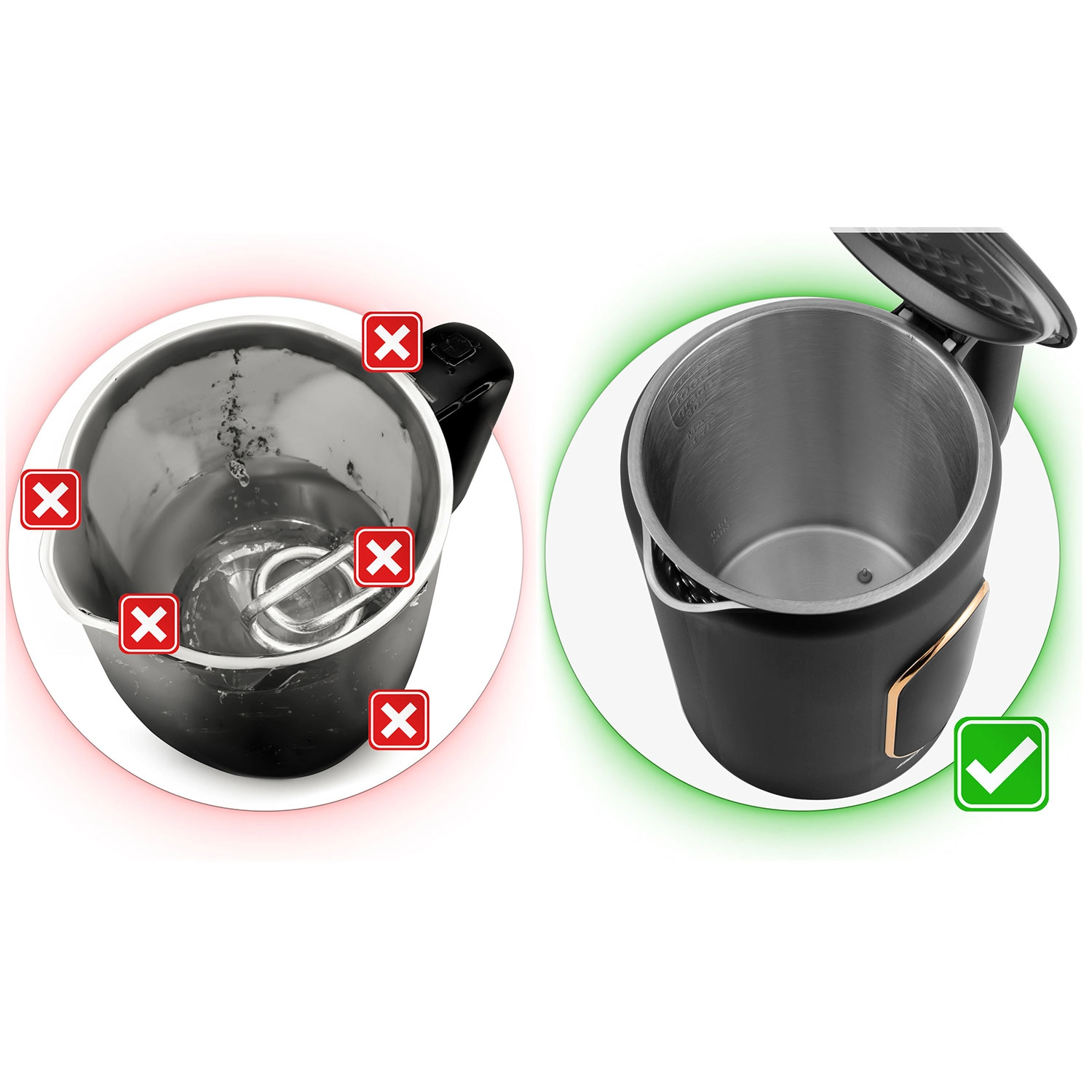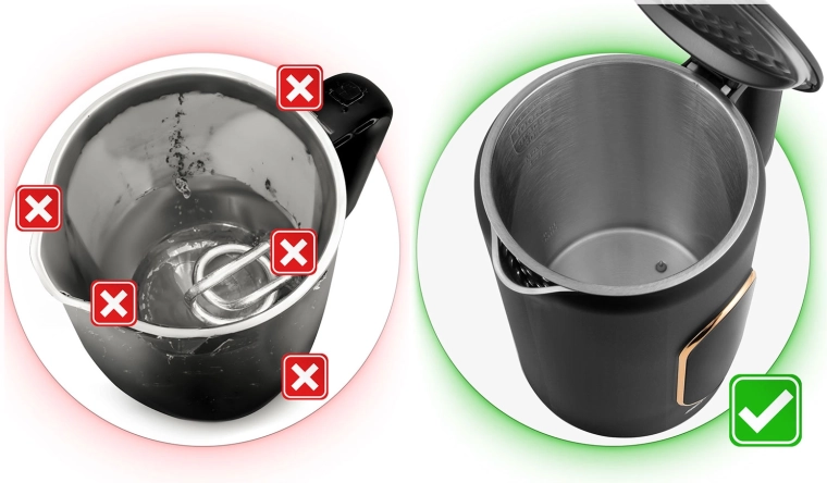 Gładkie, nierdzewne ścianki wewnętrzne SUS 304 bez zakamarków ułatwiają konserwację, poprawiają smak wody i wydłużają żywotność czajnika. Bez BPA.