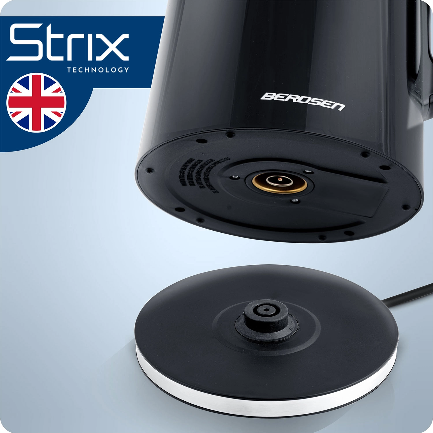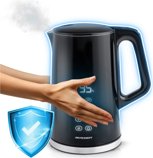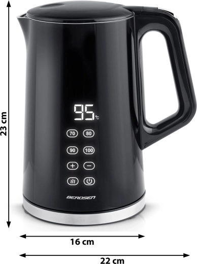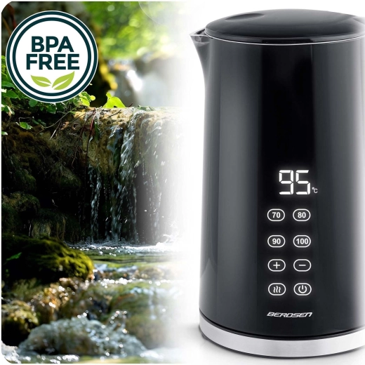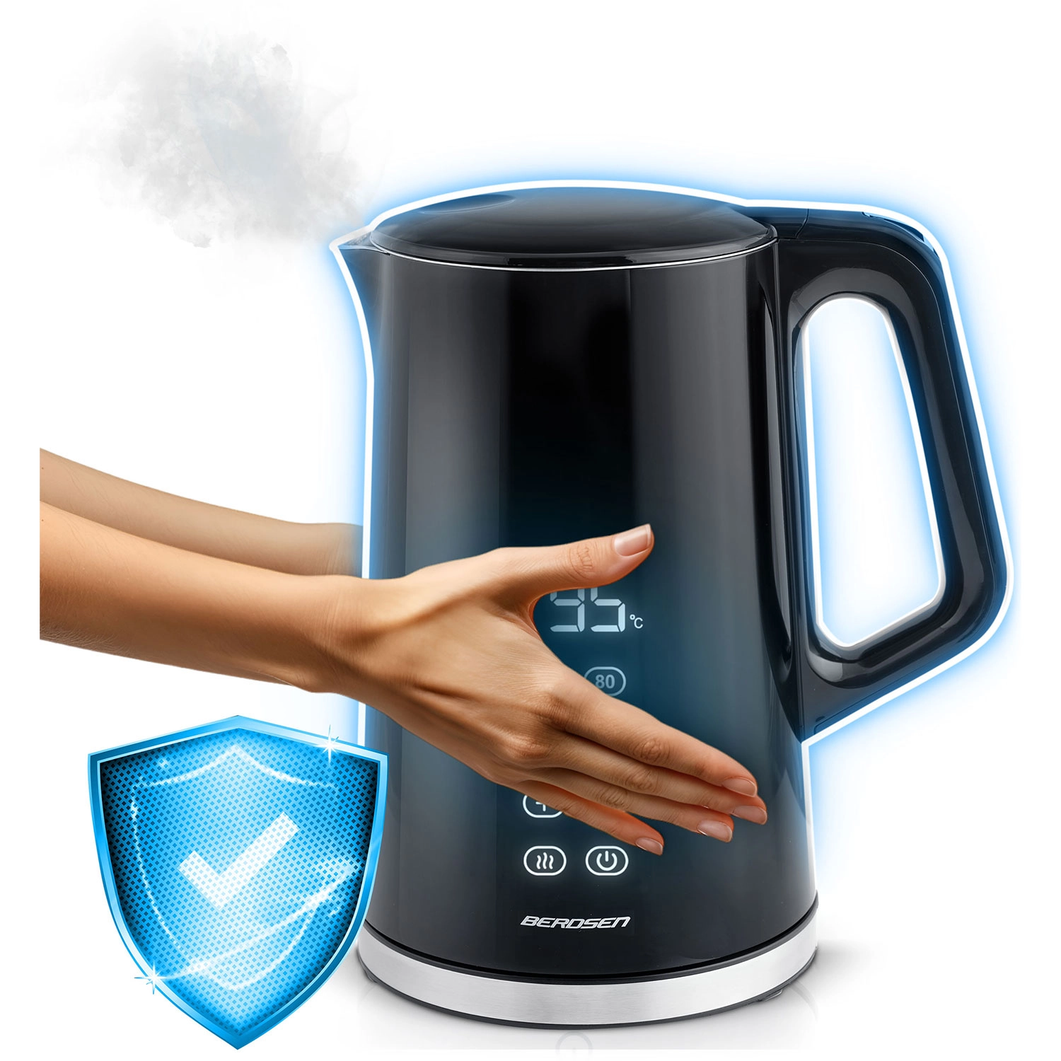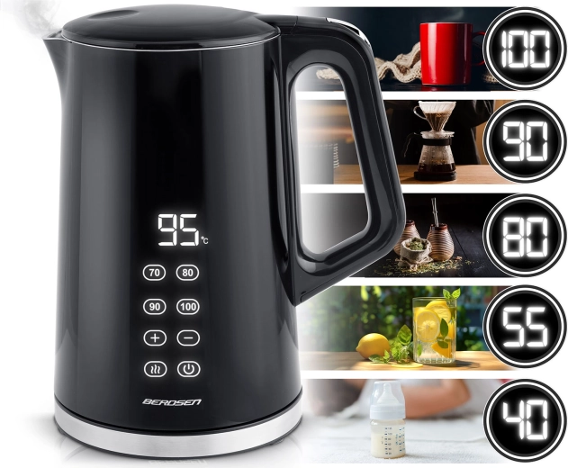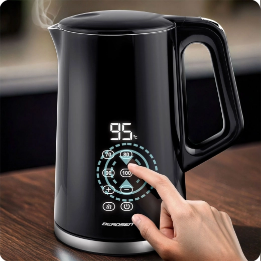 Stylowy elektryczny czajnik BERDSEN o pojemności 1,7 l oferuje precyzyjne ustawianie temperatury co 5 °C (70–100 °C), inteligentny pomiar z dokładnością do 1 °C, funkcję podtrzymania temperatury do 2 godzin oraz ciche, szybkie grzanie. Dwuwarstwowa konstrukcja CoolTouch chroni przed oparzeniem, a stalowe wnętrze SUS 304 zapewnia czysty smak wody i długą żywotność. Panel dotykowy z podświetlanym wyświetlaczem ułatwia obsługę, a nowoczesny design świetnie pasuje do każdej kuchni.