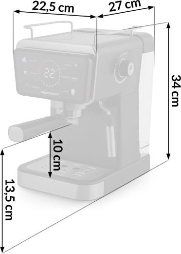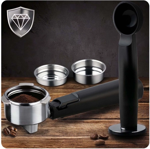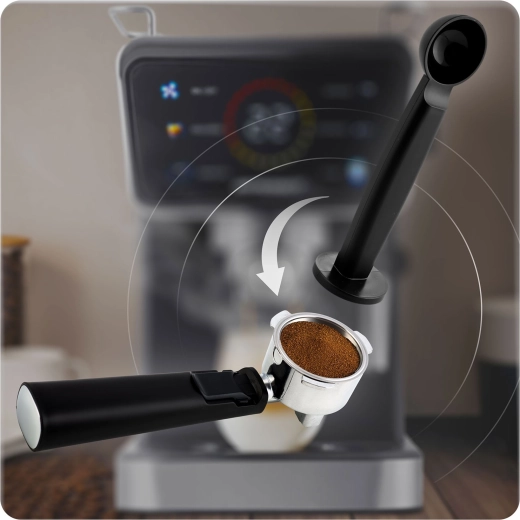 Praktyczne wyposażenie obejmuje dwa stalowe filtry (single i double), kolbę z podwójnym wylotem oraz miarkę z tamperem 2 w 1 dla precyzyjnego dozowania i równomiernego ubicia. Wyjmowana tacka ociekowa umożliwia użycie wyższych szklanek i kubków termicznych, a zbiornik na wodę 1,5 l łatwo się napełnia i czyści. Cicha praca, solidne wykonanie i bezpieczne, antypoślizgowe nóżki podnoszą komfort codziennego użytkowania.