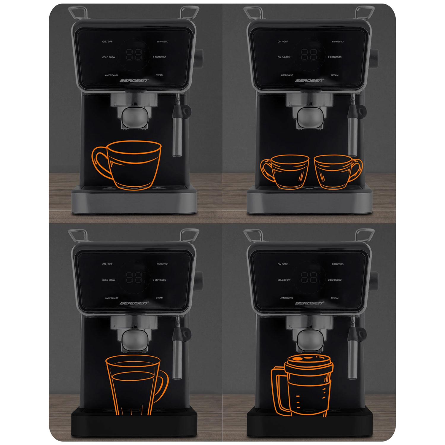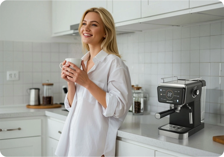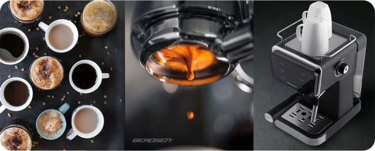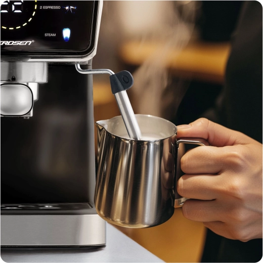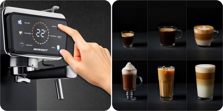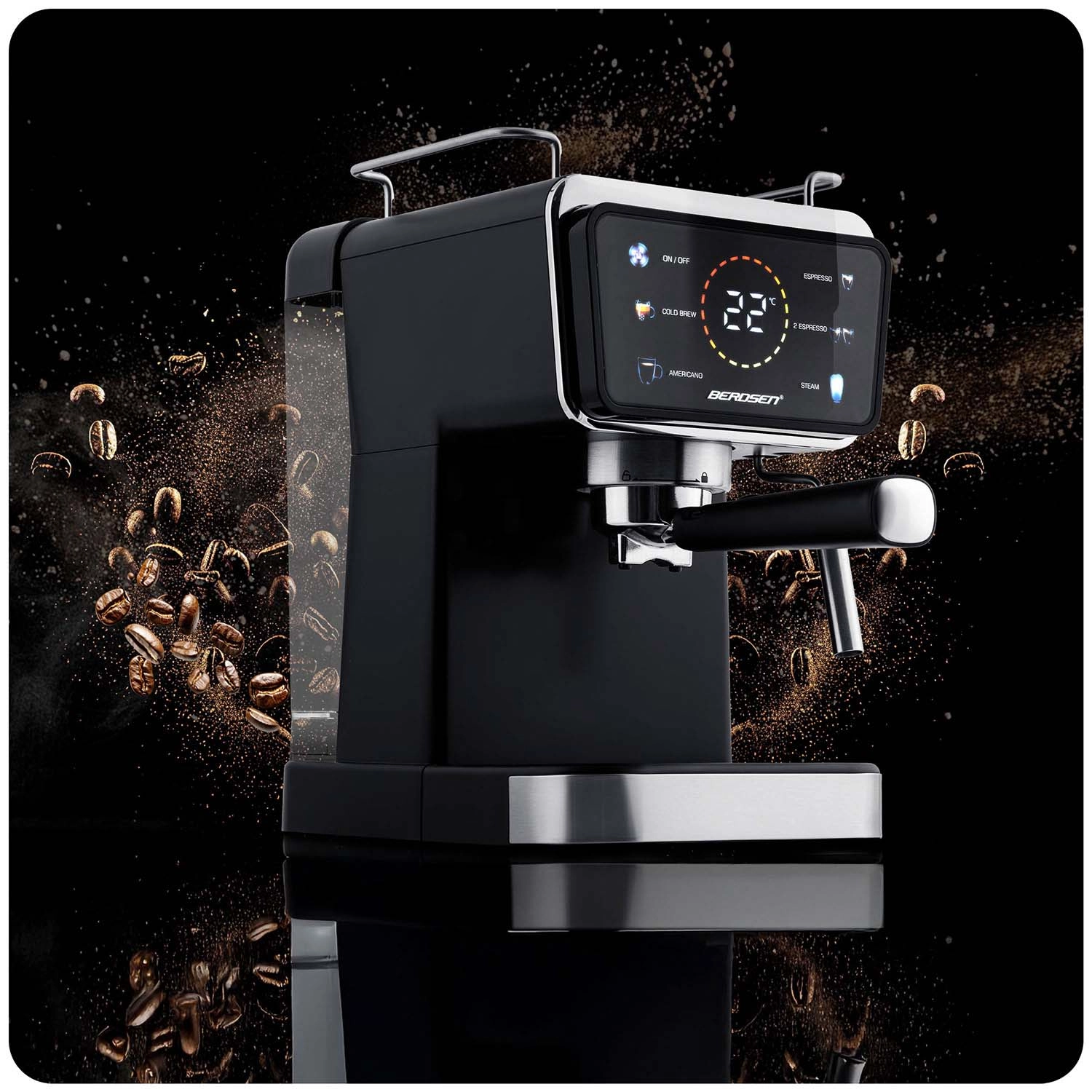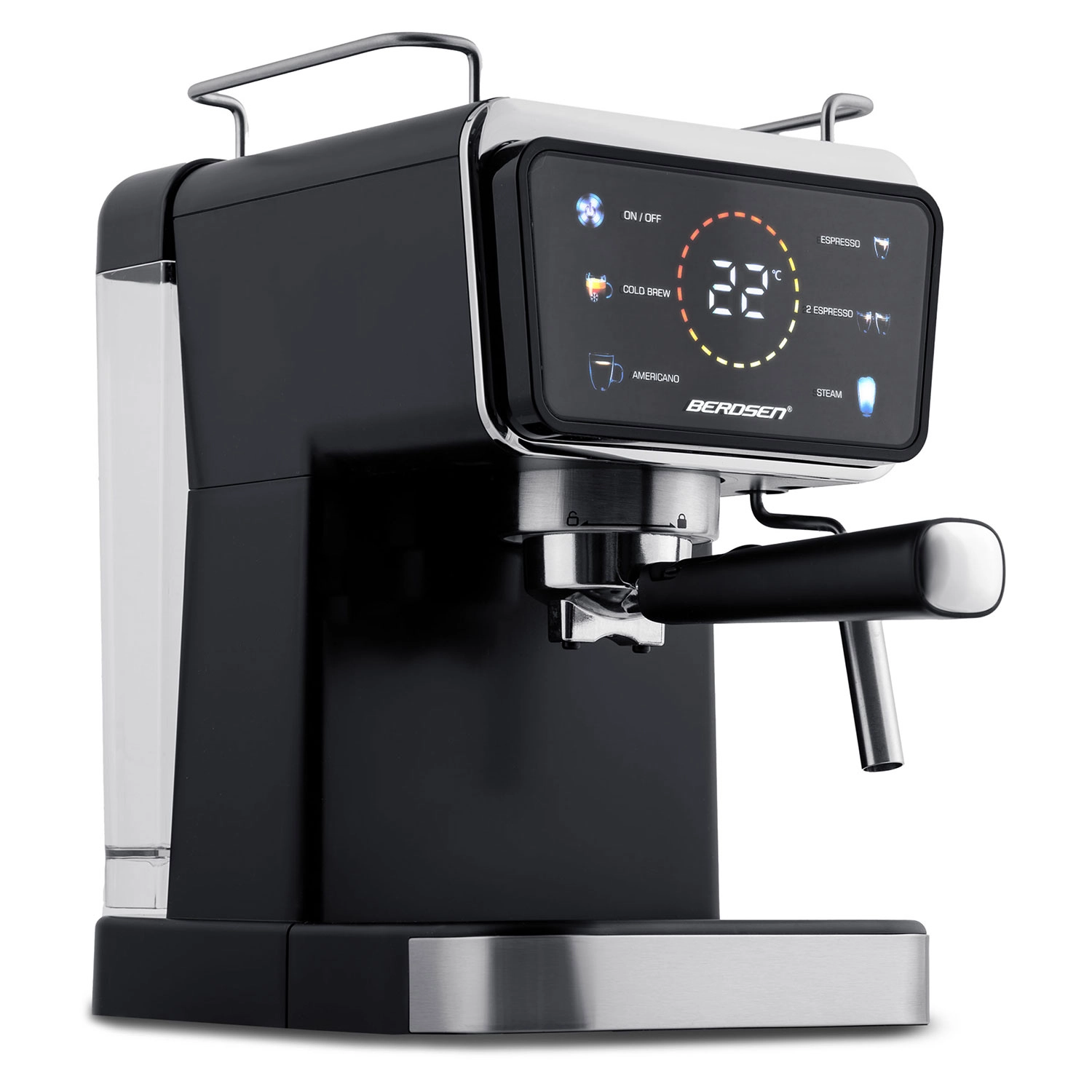 Zamień kuchnię w domową kawiarnię. Kolbowy ekspres Berdsen łączy wydajną pompę 20 bar i precyzyjny system ekstrakcji dla intensywnego aromatu, pełnego smaku i idealnej cremy. Panel dotykowy oferuje szybki wybór funkcji: espresso, para oraz zimne espresso, a profesjonalna dysza parowa tworzy gęstą, aksamitną piankę do cappuccino, latte lub flat white.