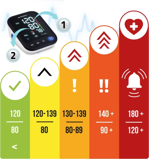- Klasyfikacja ciśnienia krwi, wykrywanie nieregularnego tętna, kontrola prawidłowego założenia mankietu, niski poziom baterii