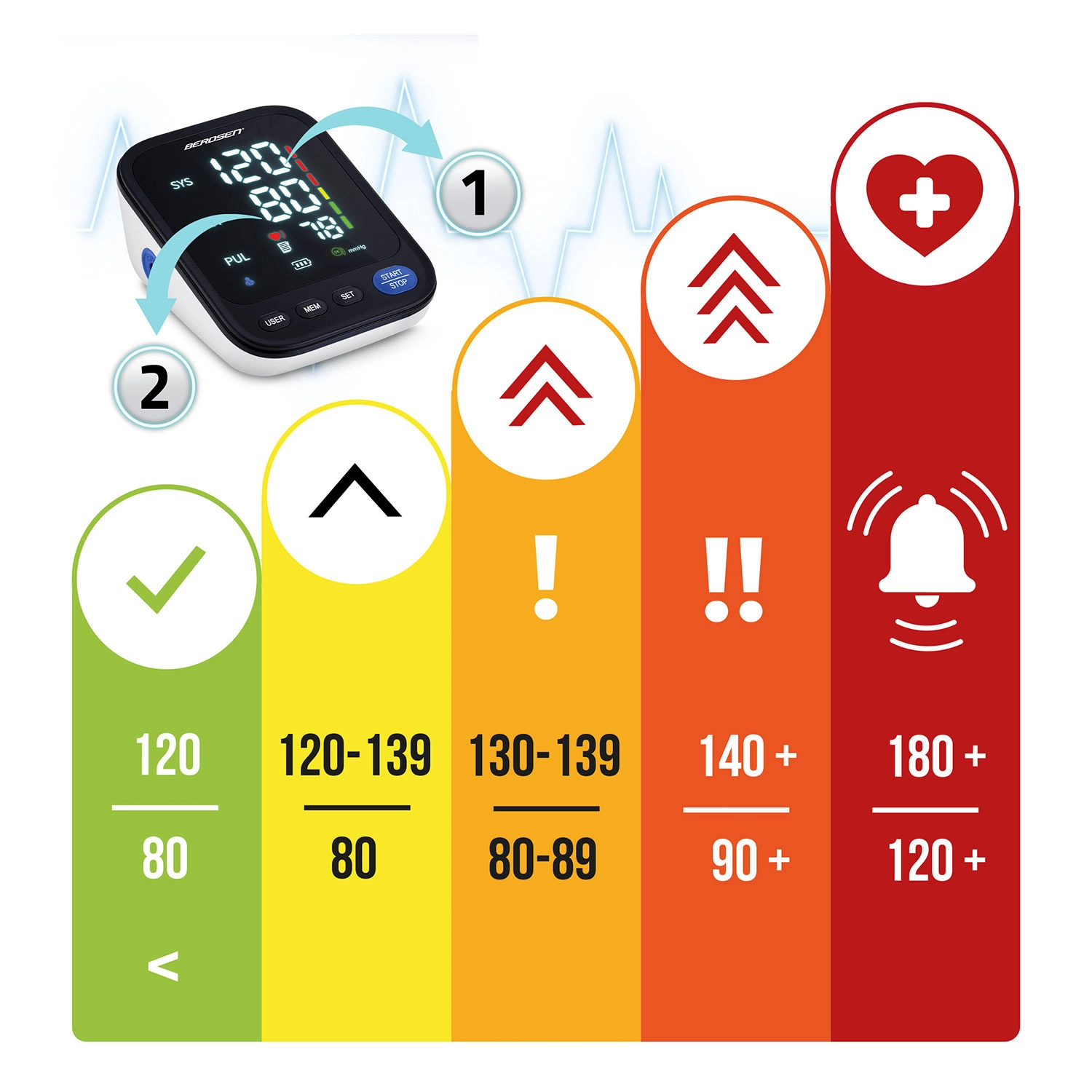 - Bezpieczne wyniki: wykrywanie nieregularnego tętna i kontrola prawidłowego założenia mankietu.