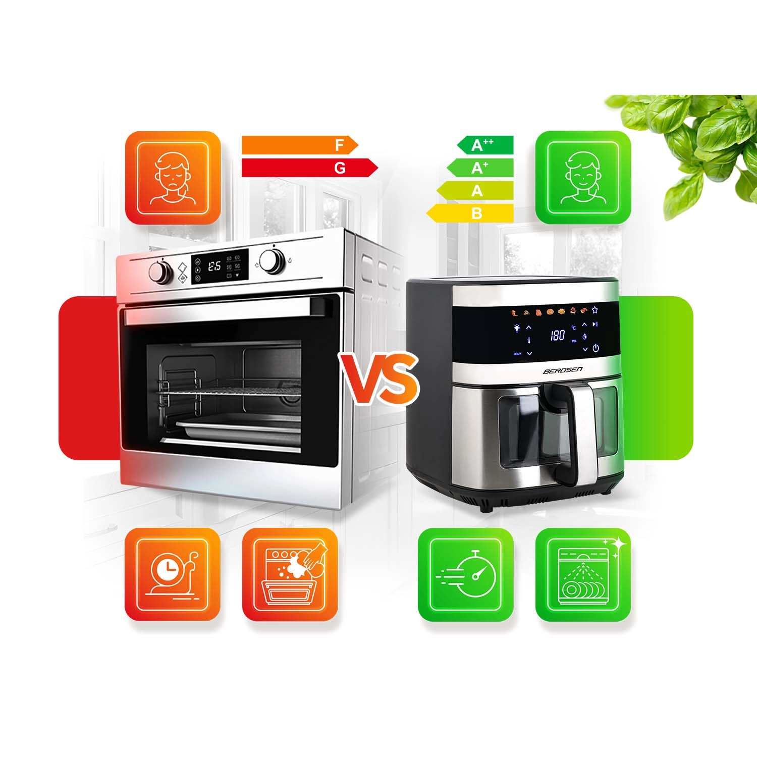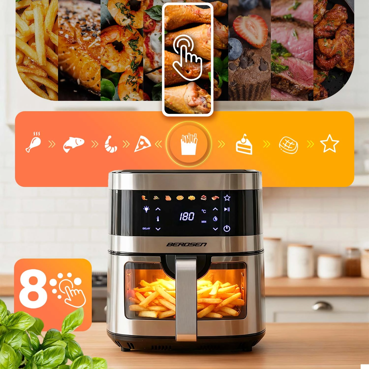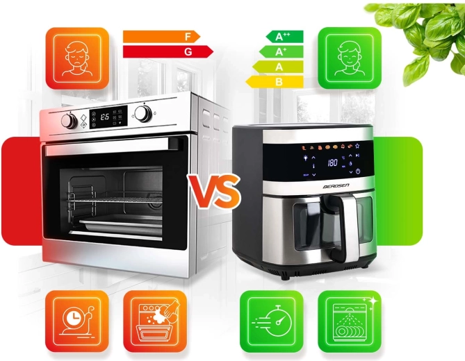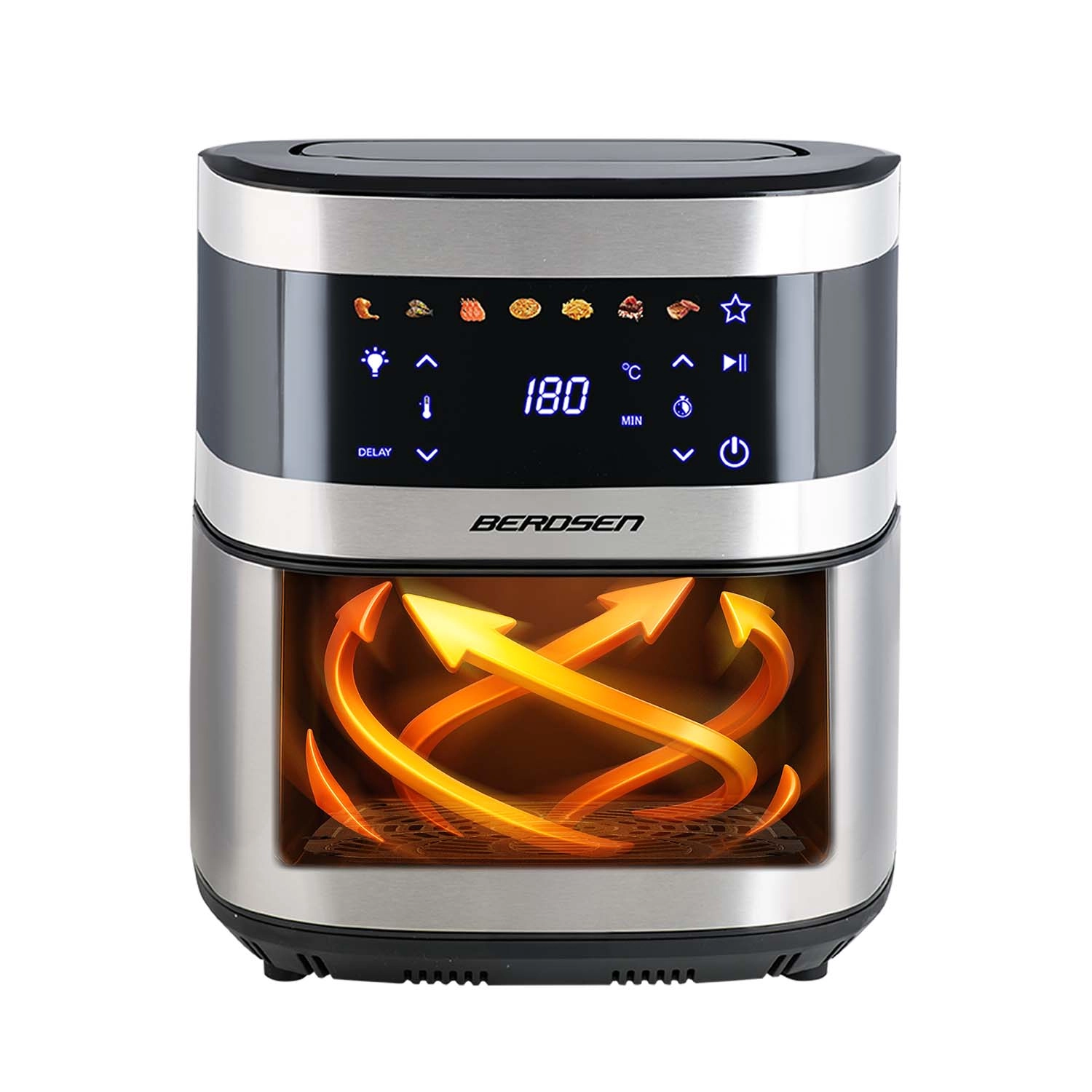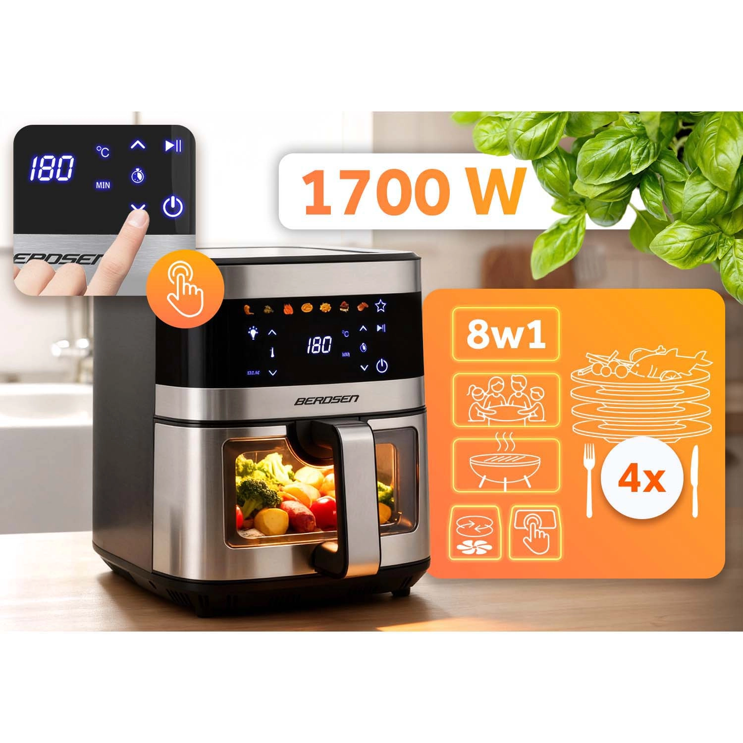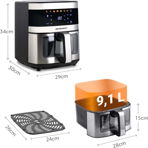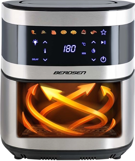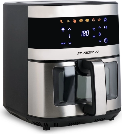 BERDSEN BD-656 łączy wysoką moc 1700 W oraz ekstra dużą misę 9,1 l dla szybkiego i równomiernego pieczenia, smażenia i grillowania przy minimalnej ilości oleju. Intuicyjny wyświetlacz dotykowy oferuje 7 programów wstępnych i precyzyjną regulację 40–200 °C. Dzięki okienku z oświetleniem LED masz kontrolę nad procesem bez przerywania.