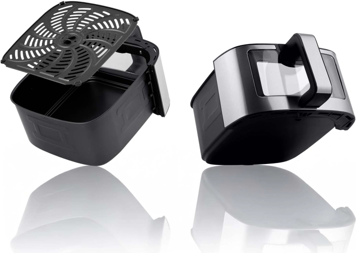 Wszechstronne zastosowanie: przygotujesz chrupiące frytki, soczystego kurczaka, warzywa, pizzę, desery, a także suszone owoce. Do tego funkcja opóźnionego startu i przypomnienie o przewróceniu. Kosz i taca mają powłokę nieprzywierającą PTFE i można je myć w zmywarce; chłodna rączka i zabezpieczenie przed przegrzaniem zwiększają bezpieczeństwo.