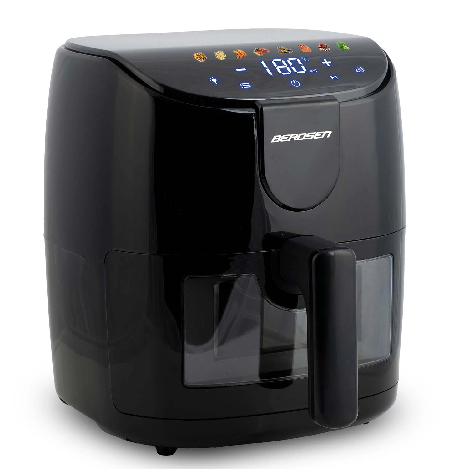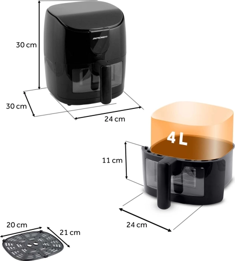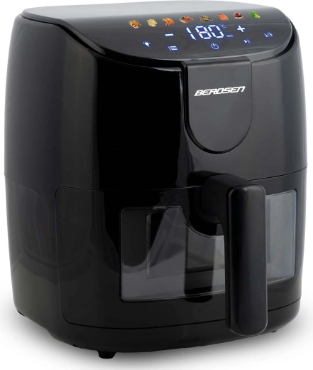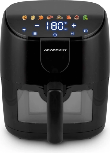 Frytkownica beztłuszczowa BERDSEN 4 l zapewnia zdrowsze smażenie przy minimalnej ilości oleju, szybkie przygotowanie i łatwą obsługę. Dzięki 8 automatycznym programom, panelowi dotykowemu oraz okienku z oświetleniem LED masz pełną kontrolę nad gotowaniem bez otwierania kosza. Mocne 1500 W, regulacja temperatury 40–200 °C oraz przypomnienie o potrząśnięciu/obróceniu potrawy gwarantują chrupiące rezultaty bez zbędnego tłuszczu.