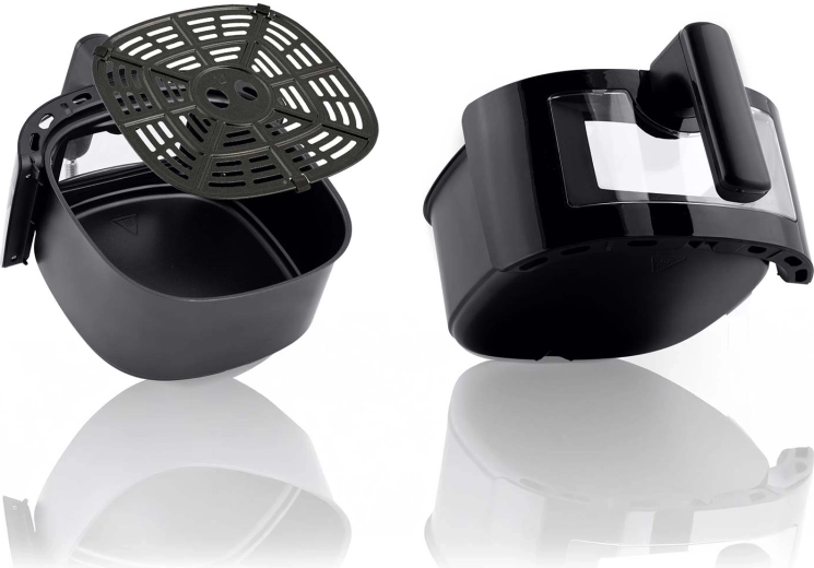 Wyjmowany kosz i perforowana wkładka z nieprzywierającą powłoką PTFE zapewniają równomierny przepływ powietrza i proste czyszczenie – elementy można myć w zmywarce.