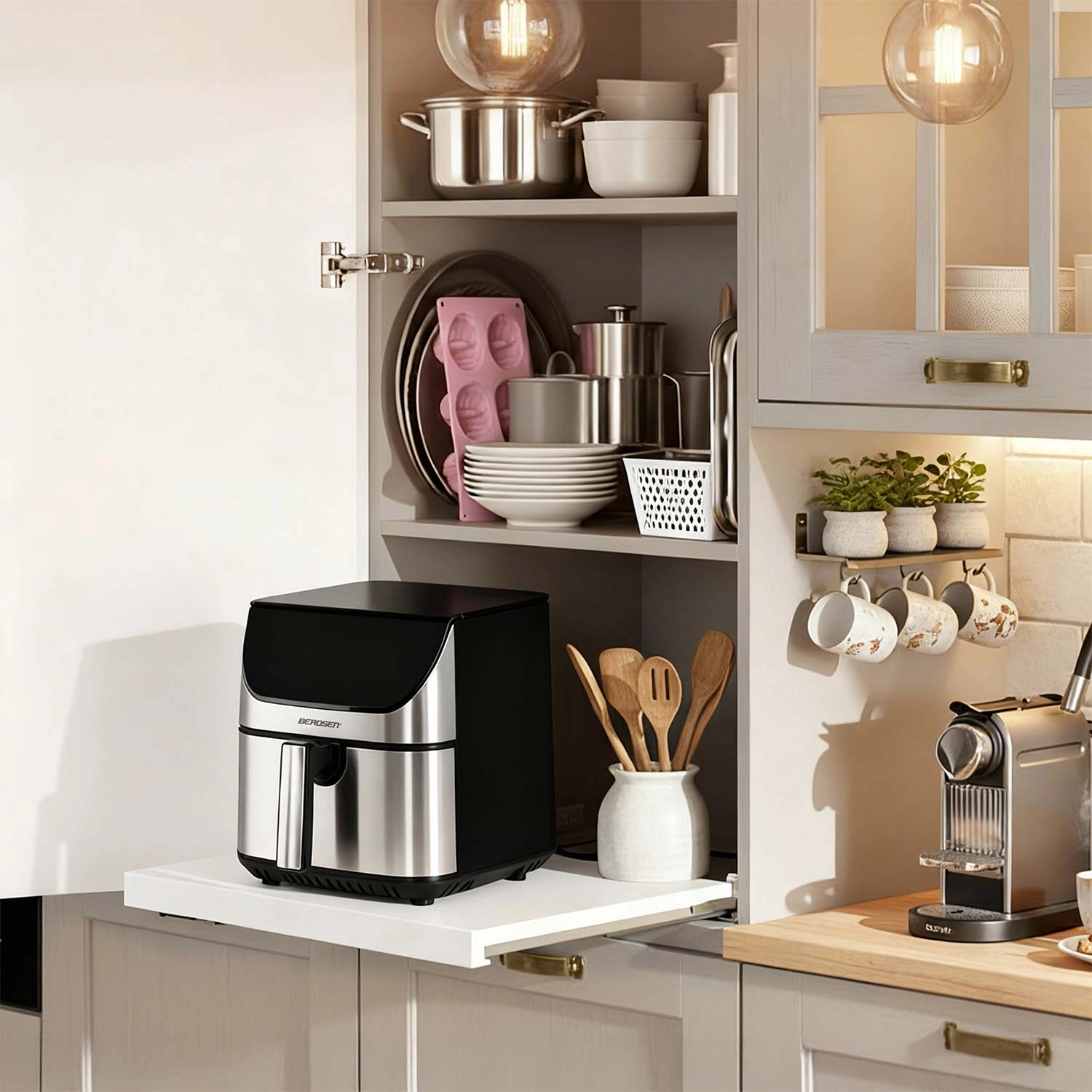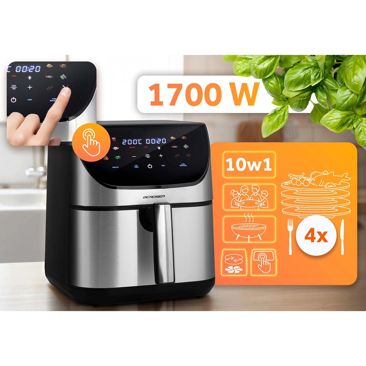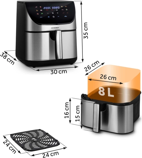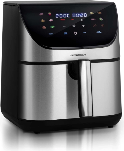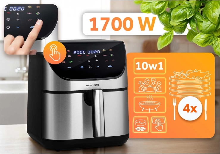 Większa pojemność, mniej tłuszczu i maksymalna wygoda – frytkownica beztłuszczowa BERDSEN 8 l o mocy 1700 W przygotuje chrupiące frytki, soczystego kurczaka i pieczone warzywa niemal bez oleju. Oferuje 12 automatycznych programów, panel dotykowy z podświetleniem, regulację temperatury do 200 °C oraz przypomnienie o potrząśnięciu/obróceniu potrawy. Wykończenie ze stali nierdzewnej łatwo się czyści i świetnie pasuje do każdej kuchni.