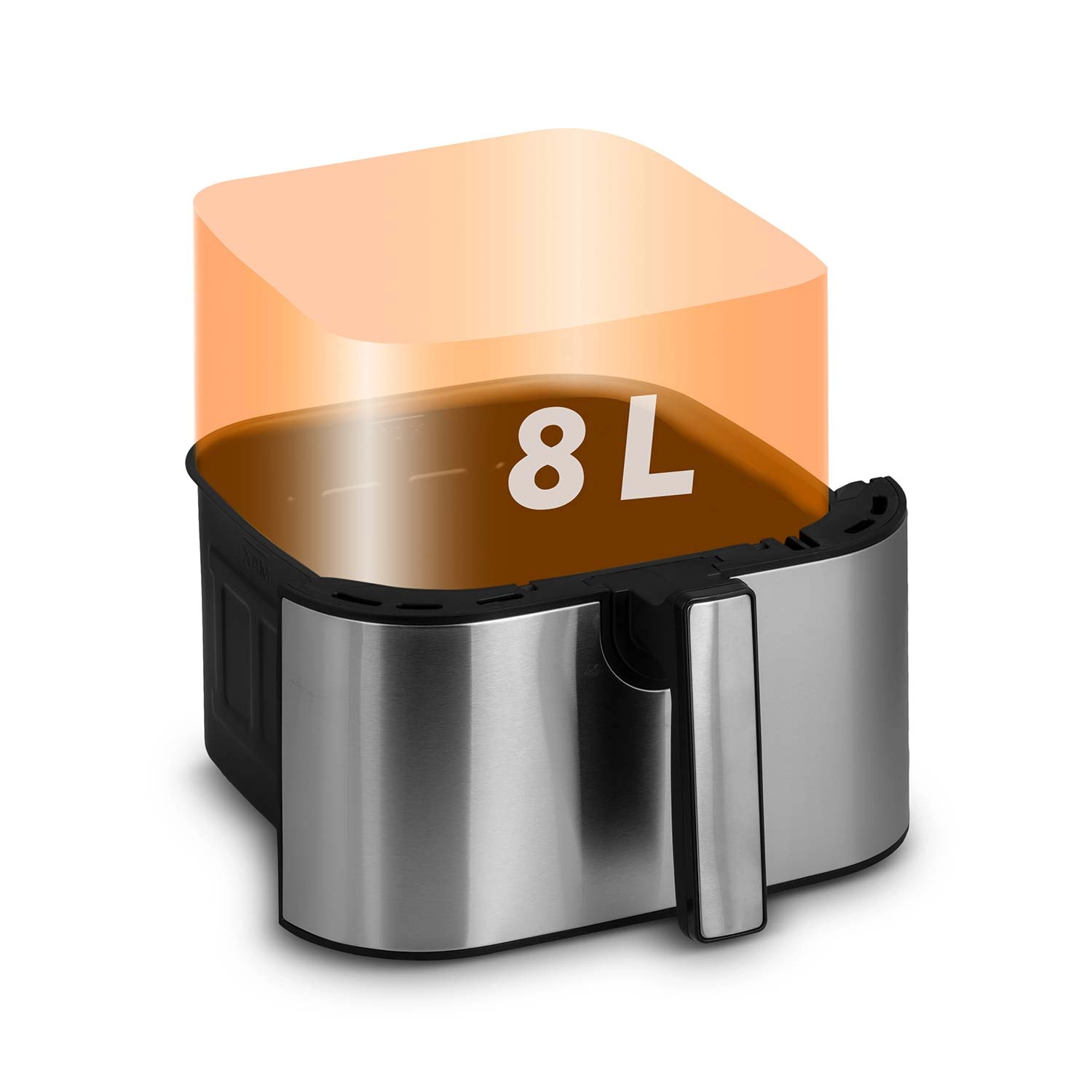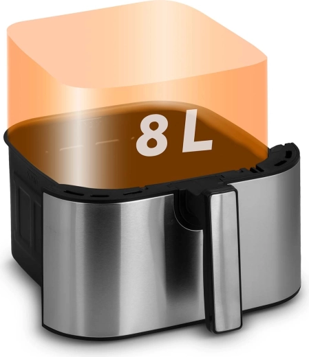 Dzięki zaawansowanej cyrkulacji gorącego powietrza uzyskasz złocistą, chrupiącą skórkę na zewnątrz i soczystość w środku – bez zapachu oleju i zbędnych kalorii. Pojemność 8 litrów wystarczy na obiad dla całej rodziny, dużą porcję frytek dla znajomych, a także na pieczenie całego kurczaka. Elementy wewnętrzne z powłoką nieprzywierającą PTFE można myć w zmywarce.