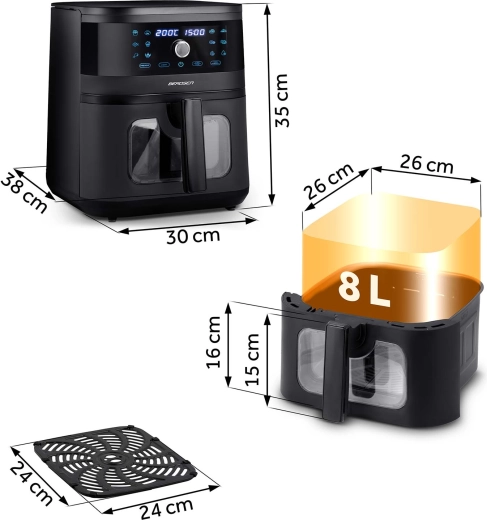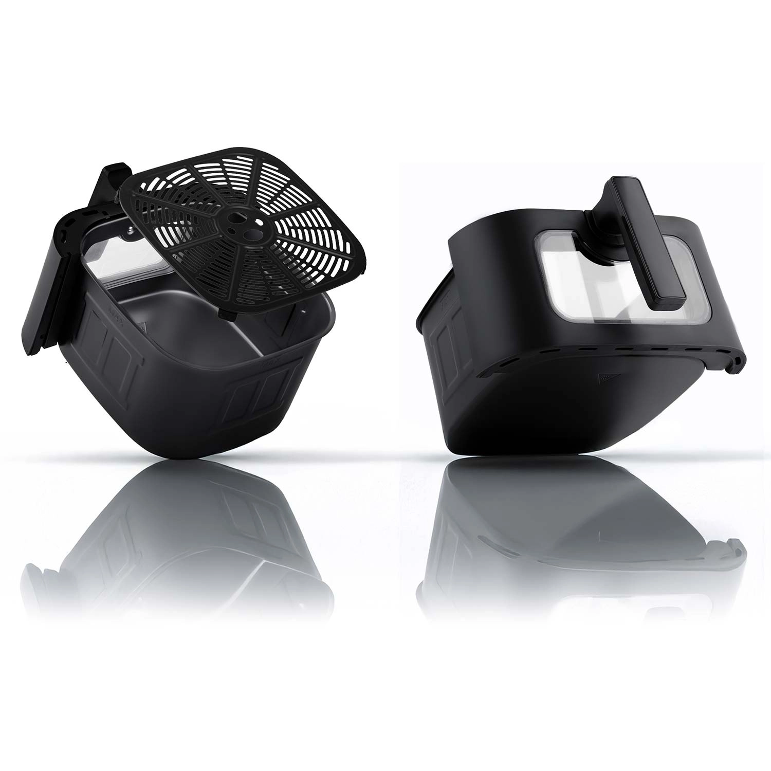 Urządzenie potrafi smażyć na gorącym powietrzu, piec, grillować, podgrzewać i suszyć – zastępuje tradycyjną frytkownicę, piekarnik, grill oraz suszarkę do żywności. Do dyspozycji jest 12 wstępnych programów (frytki, warzywa, owoce morza, ciasto/deser, udka z kurczaka, grill, stek, pizza, bekon, orzechy, suszenie, podgrzewanie/rozmrażanie), ustawienia czasu 1–60 min i temperatury 80–200 °C. Dzięki mocy 1700 W szybko się nagrzewa i przygotowuje potrawy oszczędnie oraz bez bałaganu.