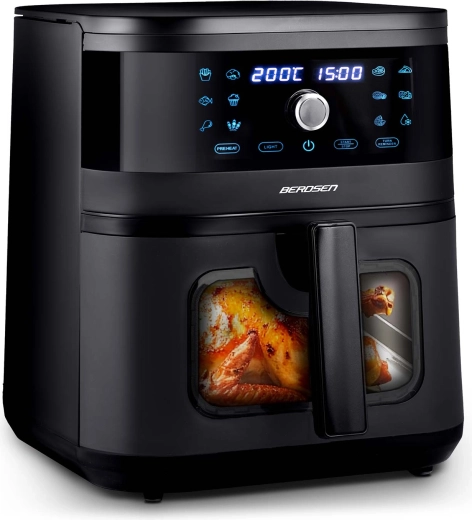 BERDSEN BD-661 to coś więcej niż frytkownica. Dzięki cyrkulacji gorącego powietrza przygotowuje potrawy chrupiące na zewnątrz i soczyste w środku przy minimalnej ilości oleju. Duża pojemność 8 l jest idealna na rodzinne obiady, całego kurczaka lub solidną porcję frytek. Panel dotykowy z czytelnymi ikonami oraz okienko z oświetleniem LED zapewniają wygodną obsługę i kontrolę pieczenia bez zbędnego otwierania kosza.