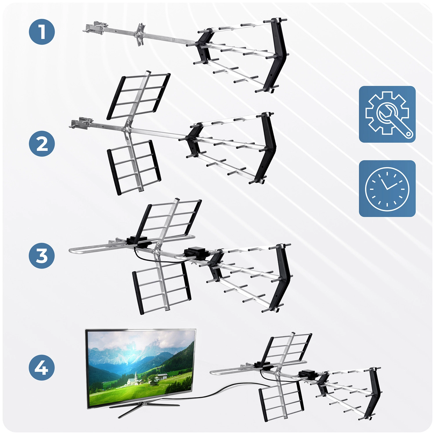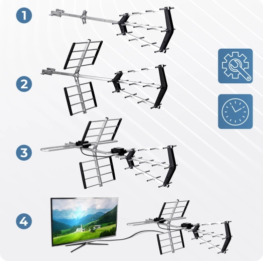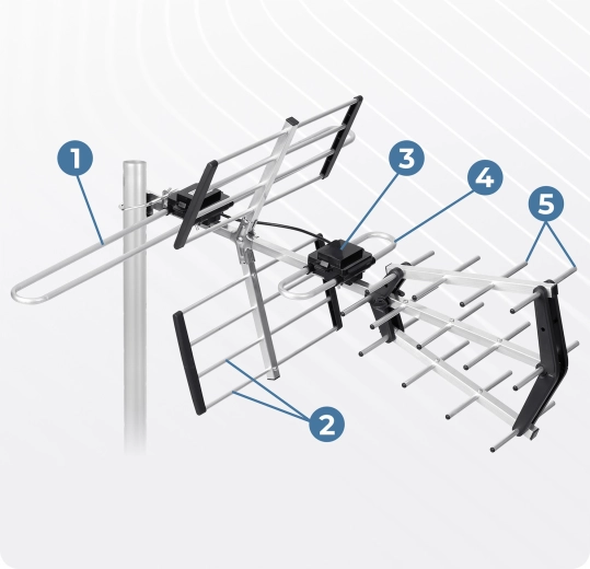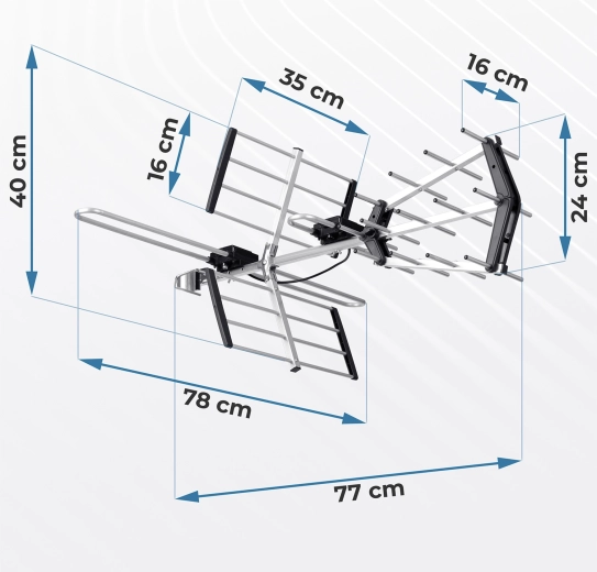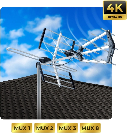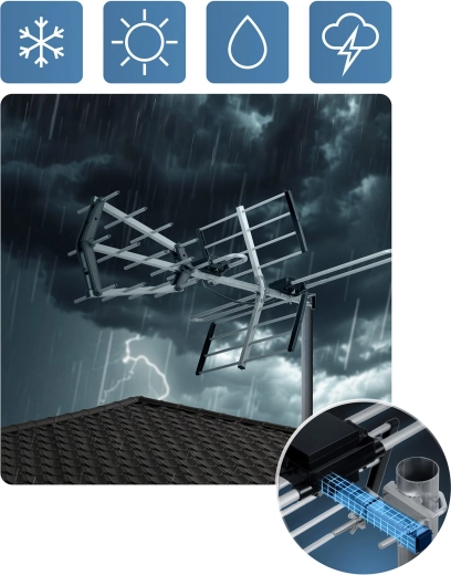 Solidna, odporna na warunki atmosferyczne konstrukcja z reflektorami i direktorami kierunkowymi zapewnia pewny odbiór nawet przy wietrze, deszczu czy mrozie. Zintegrowany filtr LTE skutecznie tłumi zakłócenia sieci 4G/5G dla czystego sygnału. Łatwy montaż bez specjalistycznych narzędzi pozwala na szybkie uruchomienie w kilka minut.