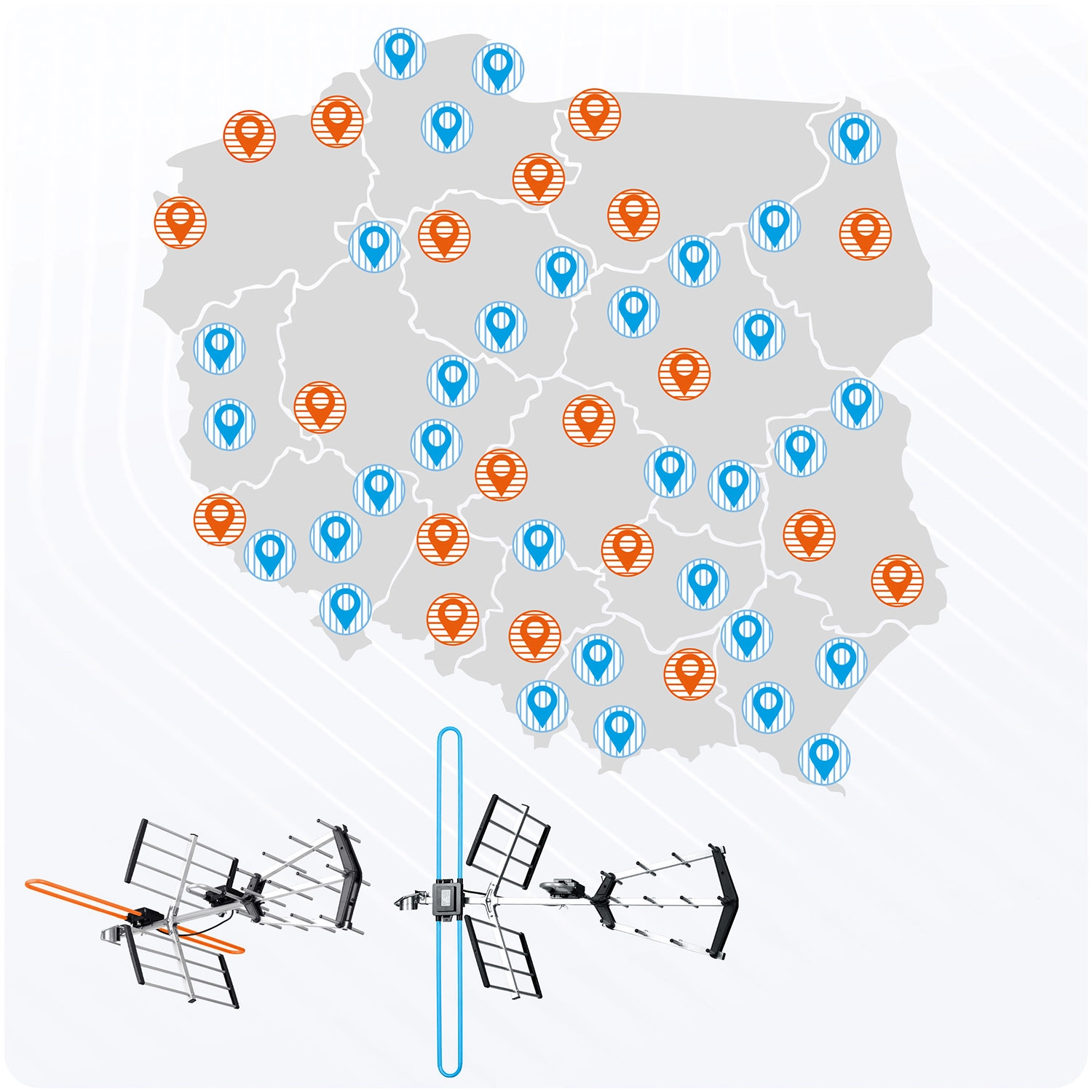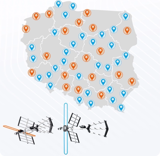 - VHF/UHF – pokrycie wszystkich multipleksów MUX 1–8.